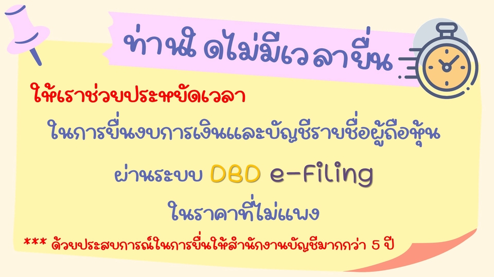 มีประสบการณ์ยื่นงบการเงินและบัญชีรายชื่อผู้ถือหุ้นผ่านระบบ DBD e-filing ให้สำนักงานบัญชีมากกว่า 5 ปี