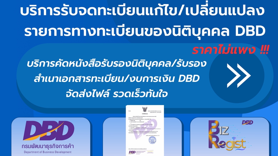 บริการรับจดทะเบียนแก้ไข/เปลี่ยนแปลง รายการทางทะเบียนของนิติบุคคล DBD / บริการคัดหนังสือรับรองนิติบุคคล/รับรองสำเนาเอกสารทะเบียน