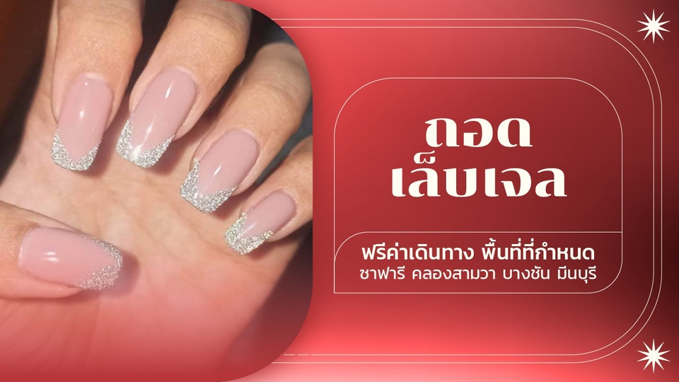 "💅 บริการทำเล็บ (ฟรีค่าเดินทางในพื้นที่ที่กำหนด!) 💅 📍 พื้นที่ให้บริการฟรีค่าเดินทาง ย่าน ซาฟารีเวิลด์, คลองสามวา, บางชัน, มีนบุรี 💖 บริการและราคา ✅ ถอดเล็บเจล – 100 บาท (ลูกค้าเก่าฟรี!) 🚗 ค่าบริการเดินทาง (เฉพาะนอกพื้นที่ที่กำหนด) 10 กิโลเมตรแรก ค่าบริการ 350 บาท ระยะทางถัดไป คิดเพิ่ม กิโลเมตรละ 45 บาท ให้บริการนอกสถานที่สูงสุด 20 กิโลเมตร 📢 จองคิวหรือสอบถามเพิ่มเติมได้เลยค่ะ! 💕" ขั้นตอนการทำงาน 1. ตกลงคุยรายละเอียดงานและสถานที่ 2. ลูกค้าชำระเงิน 3. ช่างไปทำเล็บตามรายละเอียดและสถานที่ที่ตกลงไว้ 4. ส่งงาน