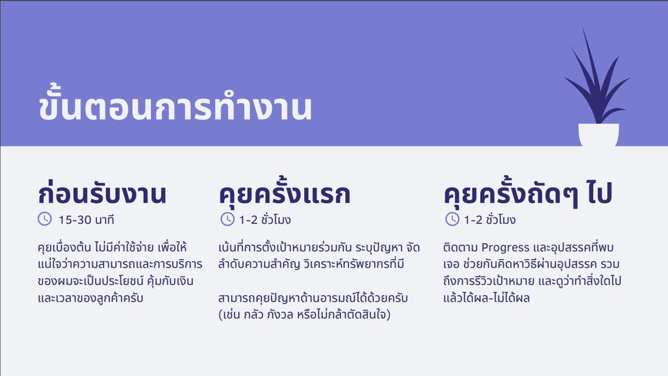 สวัสดีครับ ผมชื่อแคมป์ (ธนพล) ผมทำงานอยู่ในสายงานที่ปรึกษามามากกว่า 6 ปี ทั้งในบริษัทที่ปรึกษาธุรกิจระดับ Top 3 ของโลก และในบริษัท Software Consulting ระดับนานาชาติครับ ปัจจุบันก็ยังทำอยู่ สำหรับการร่วมงานกับผม สิ่งที่จะได้หลังจากทุกๆ ครั้งที่มีการพบกันก็คือ "Next Step ว่าจะทำอย่างไรกับธุรกิจต่อไปดี เพื่อแก้ปัญหา และใช้ทรัพยากรให้บรรลุเป้าหมายให้ได้มากที่สุด" ผมจึงเรียกบริการนี้ว่าเป็น "เพื่อนคู่คิด" มากกว่าการเป็นโค้ช หรือการมีสูตรสำเร็จครับ ก่อนการรับงาน จะมีการคุยกันก่อน 15-30 นาที เพื่อคุยความคาดหวัง ระยะเวลา และดูว่าบริการของผมจะมีประโยชน์กับคุณลูกค้าได้คุ้มราคาและเวลาไหมครับ ถ้าตกลงรับงาน ในการเจอกันครั้งแรก 1. เราจะเน้นที่การตั้งเป้าหมายร่วมกัน เน้นการระบุและจัดสำดับความสำคัญ 2. ดูทรัพยากรในธุรกิจที่มี จุดแข็ง จุดอ่อน 3. สามารถคุยปัญหาด้านอารมณ์ได้ด้วยครับ (เช่น กลัว กังวล หรือไม่กล้าตัดสินใจ) ในการพบกันหลังจากนั้น 1. เราจะติดตาม progress 2. รีวิวปัญหาและอุปสรรคที่เจอ 3. สะท้อนความคิด คุยกันว่าจะทำอะไรต่อ 4. รีวิวสิ่งที่ ได้ผล-ไม่ได้ผล การบริการของผมจะคอยช่วยคิด สะท้อนความคิด ตั้งคำถาม ไปจนถึงการรีวิวตัวเลข Performance ของธุรกิจด้วยกัน ซึ่งจะช่วยให้ปัญหาของธุรกิจต่างๆ มีความชัดเจนมากขึ้น ทำให้เรามั่นใจมากขึ้นว่าควรทำอย่างไรต่อกับธุรกิจของเราครับ ขั้นตอนการทำงาน 1. คุยเบื้องต้นก่อนรับงาน 15-30 นาที เพื่อดูว่าการบริการจะเป็นประโยชน์ คุ้มกับเงินและเวลาไหม 2. คุยครั้งแรก จะเน้นการตั้งเป้าหมาย จัดลำดับความสำคัญ และวิเคราะห์ทรัพยากรที่มี 3. ุคุยครั้งถัดๆ ไปจะเน้นการติดตามผล วิเคราะห์ร่วมกันว่าจะผ่านอุปสรรคต่างๆ อย่างไร 4. คุยกันแต่ละครั้งไม่เกิน 2 ชั่วโมง จะเน้นให้มี Next Step กลับไปลองทำเสมอ 5. การติดตามผล จะคุยด้วยว่า สิ่งที่นำไปลองทำ ได้ผลหรือไม่ได้ผลอย่างไร เพื่อปรับแผน
