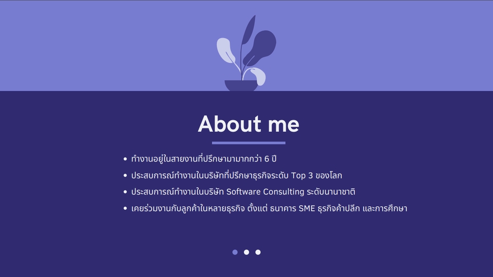 ผมมีประสบการณ์ 2 ปีที่บริษัท McKinsey & Company ซึ่งเป็นบริษัทที่ปรึกษาชั้นนำระดับโลก และ 4.5 ปีในตำแหน่ง Project Manager ที่ Thoughtworks บริษัทที่ปรึกษา IT ระดับนานาชาติ เคยร่วมงานกับลูกค้าในธุรกิจค้าปลีก บริการซอฟต์แวร์ ธนาคาร SME หน่วยงานภาครัฐ องค์กรไม่แสวงหาผลกำไร และการศึกษา ผมเชี่ยวชาญในการช่วยเจ้าของธุรกิจจัดลำดับความสำคัญ พัฒนากลยุทธ์ เพิ่มยอดขาย และสร้างระบบซอฟต์แวร์ให้สำเร็จ