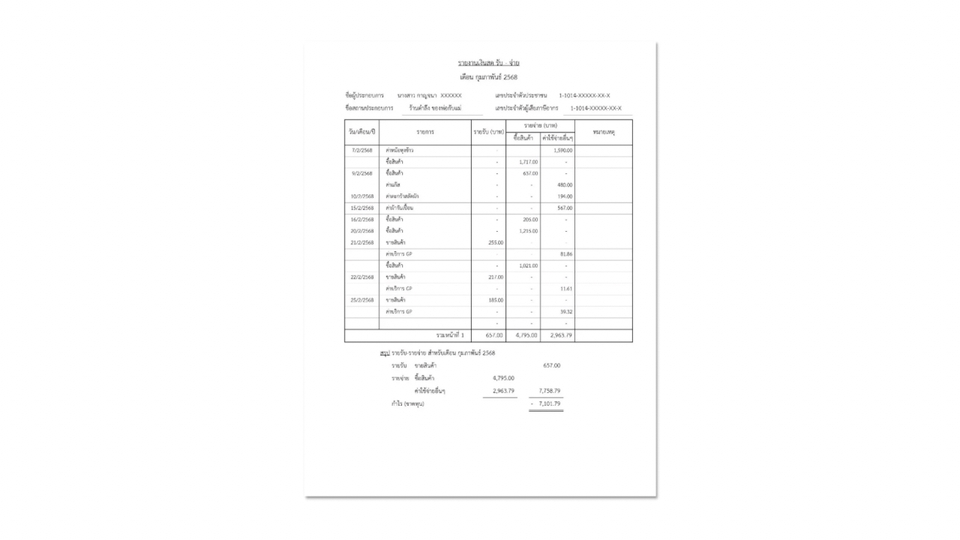 รวบรวม จัดเก็บ และบันทึกค่าใช้จ่าย รายงานเงินสดรับจ่าย แบบยอดรวมรายวัน สำหรับร้านค้าบุคคล