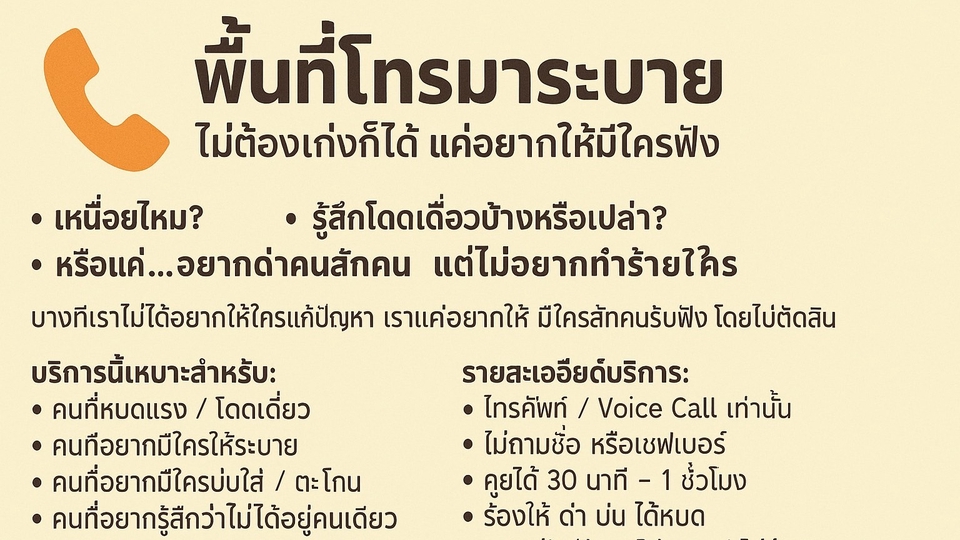 เหนื่อยไหม? 😓 รู้สึกโดดเดี่ยวบ้างหรือเปล่า? 😤 หรือแค่…อยากด่าคนสักคน แต่ไม่อยากทำร้ายใคร บางทีเราไม่ได้อยากให้ใครแก้ปัญหา เราแค่อยากให้ มีใครสักคนรับฟัง โดยไม่ตัดสิน ⸻ ✅ บริการนี้เหมาะสำหรับ: • คนที่กำลังรู้สึก หมดแรง / เครียด / เบื่อหน่าย / โดดเดี่ยว • คนที่อยากมีใครให้ ระบาย เรื่องที่คาใจ (งาน / ความรัก / ครอบครัว) • คนที่อยากมีใครให้ ด่าแทน / บ่นใส่ / ร้องไห้ / ตะโกน • คนที่อยากรู้สึกว่า “กูไม่ได้อยู่คนเดียวบนโลกนี้” ⸻ 🔧 รายละเอียดบริการ: • คุยแบบโทรศัพท์ / Voice Call เท่านั้น (ไม่เปิดกล้อง) • ไม่ถามชื่อจริง ไม่เซฟเบอร์ ไม่ถามซ้ำ • คุยได้ 30 นาที – 1 ชั่วโมง • จะร้องไห้ ด่า บ่น นิ่งเงียบ หรือหลุดหัวเราะก็ได้หมด • เรา ไม่สอน / ไม่สั่ง / ไม่สรุปชีวิตให้ – แค่รับฟังอย่างตั้งใจ ⸻ 💵 ค่าบริการ: • 📞 ครั้งละ 99 บาท • 📦 แบบ 3 ครั้ง (สำหรับคนที่อยากมีพื้นที่ฟังแบบต่อเนื่อง): 250 บาท ⸻ 💬 หมายเหตุ: • ไม่ใช่นักจิตวิทยา / ไม่ใช่หมอ • แต่เป็น คนธรรมดาที่เข้าใจความรู้สึก “ไม่ไหวแล้วว่ะ” • เคยผ่านความรู้สึกนั้นมา เลยรู้ว่าบางทีมันโคตรต้องการแค่ “ใครสักคน” ที่อยู่ตรงนี้