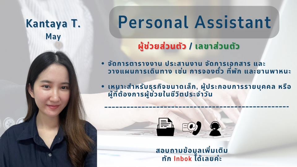 ผู้ช่วยส่วนตัว / เลขาส่วนตัว (Online) 1. จัดตารางนัดหมายส่วนตัว 2. วางแผนการเดินทาง จองร้านอาหาร โรงแรม หรือบริการต่างๆ 3. ช่วยจำ และเตือนวันสำคัญ เช่น วันชำระค่าใช้จ่ายต่างๆ นัดหมาย วัดเกิด ฯลฯ 4. ประสานงานกับบุคคลอื่นแทนคุณ 5. คิด ช่วยวางแผน หรือดูแลโปรเจกต์ส่วนตัว 6. และงานอื่น ๆ ที่คุณต้องการให้ช่วยเป็นพิเศษ ขั้นตอนการทำงาน 1. พูดคุยรายละเอียดเบื้องต้น 2. ตกลงขอบเขตงาน และระยะเวลา 3. เริ่มทำงาน และอัปเดตงานอย่างสม่ำเสมอ 4. ปรับแก้หรือเพิ่มเติมตามสถานการณ์ 5. ส่งมอบงาน 💢 หมายเหตุ: ค่าบริการไม่รวมค่าใช้จ่ายเพิ่มเติม เช่น ค่าเดินทาง ค่าขนส่ง ค่าซื้อของขวัญ หรือค่าจองโรงแรม/ตั๋ว และค่าใช้จ่ายอื่น ๆ ที่เกี่ยวข้องกับการทำงาน ประสบการณ์ทำงาน ✔️ Executive Secretary – เชี่ยวชาญด้านการบริหารงานผู้บริหาร วางแผนงาน และการประชุม ✔️ Business Development – มีประสบการณ์ในการพัฒนาธุรกิจ วิเคราะห์โอกาสตลาด และสร้างการเติบโต