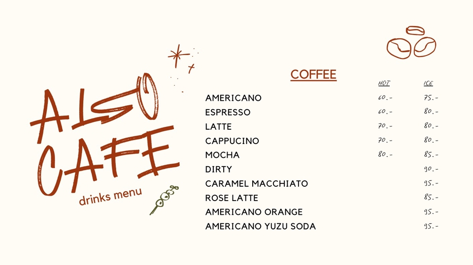 ออกแบบเมนูเครื่องดื่ม-อาหารให้กับ Also Cafe ประกอบด้วยตัวหนังสือภาษาอังกฤษและรูปวาดแบบลายเส้นในแบบของเราเอง เพื่อความแตกต่างแตกต่าง ออกแบบให้เข้ากับเอกลักษณ์ของร้านคาเฟ่ น่ารักและเป็นกันเอง มีสีสัน ง่ายต่อการอ่าน ขั้นตอนการทำงาน 1. บรีฟงานกับเจ้าของร้านฟังรายละเอียด mood board 2. เริ่มวาดร่างแบบ 3. ส่งให้ลูกค้าดูเพื่อแก้และรอคอนเฟิร์มงาน 4. ลูกค้าคอนเฟิร์มแล้วเริ่มทำในโปรแกรมออกแบบ 5. ส่งให้ลูกค้าดูดราฟแรก 6. แก้เสร็จส่งให้ลูกค้าคอนเฟิร์ม 7. ลูกค้าคอนเฟิร์มแล้วส่งไฟล์ให้ลูกค้า