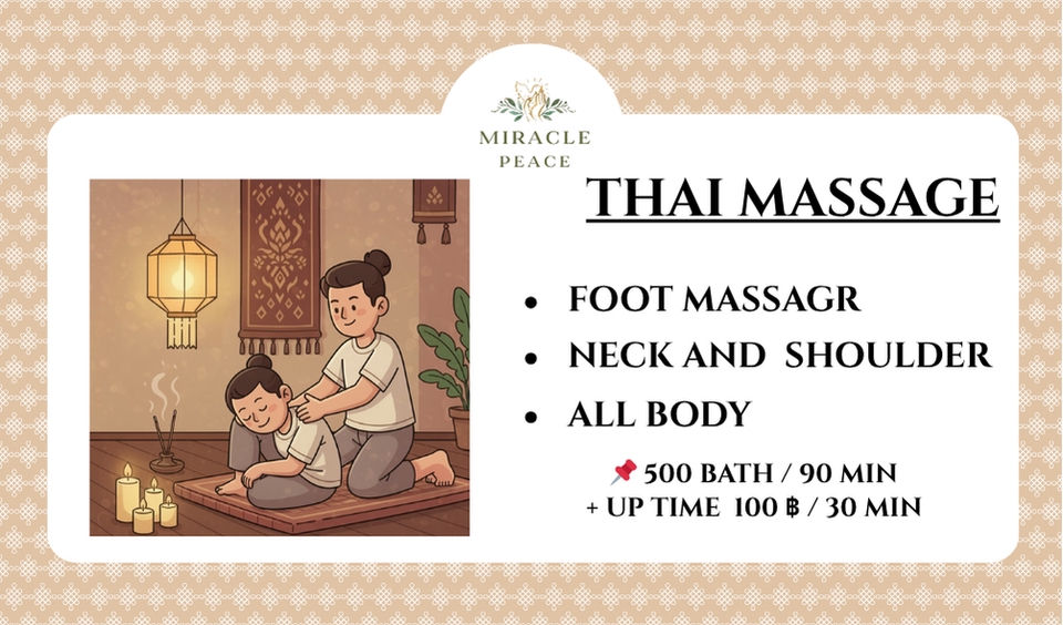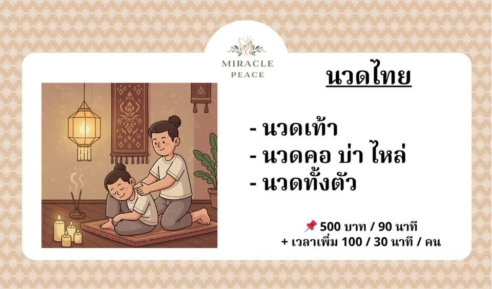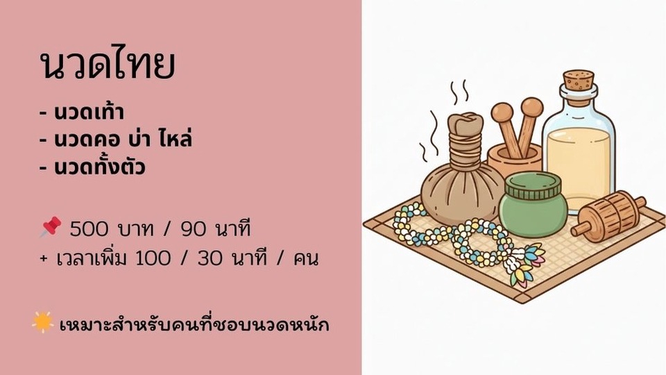 ฿500นวดไทย (ไม่มีน้ำมัน) - นวดเท้า - นวดคอบ่าไหล่ - นวดตัว 🌟 เหมาะสำหรับคนนวดหนัก 📌 500 บาท / 90 นาที + เวลาเพิ่ม 100 / 30 นาที / คน 🚄เดินทางฟรีตามแนวรถไฟฟ้าในเขตพื้นที่ จ.นนทบุรี