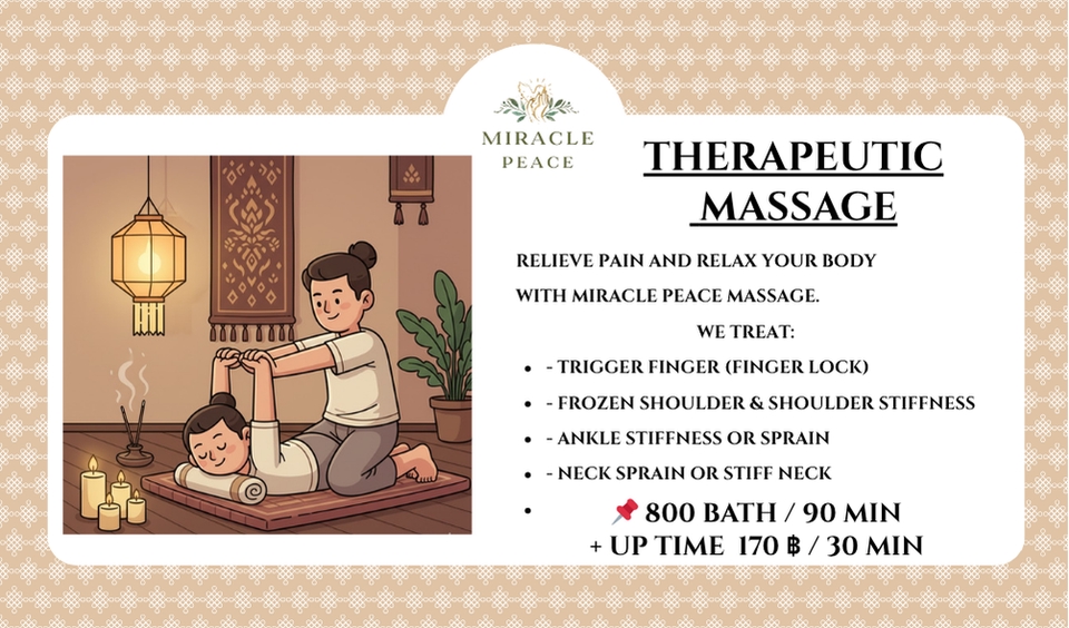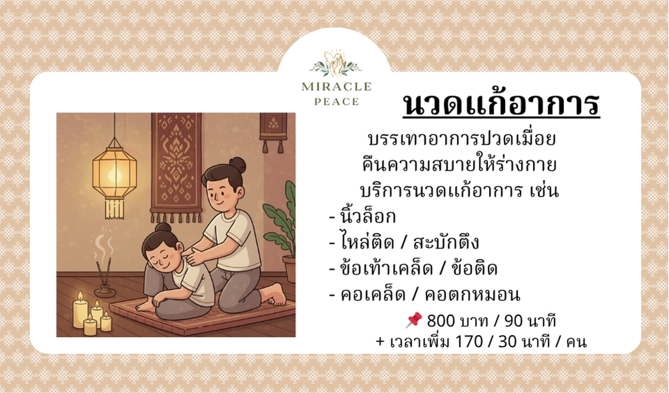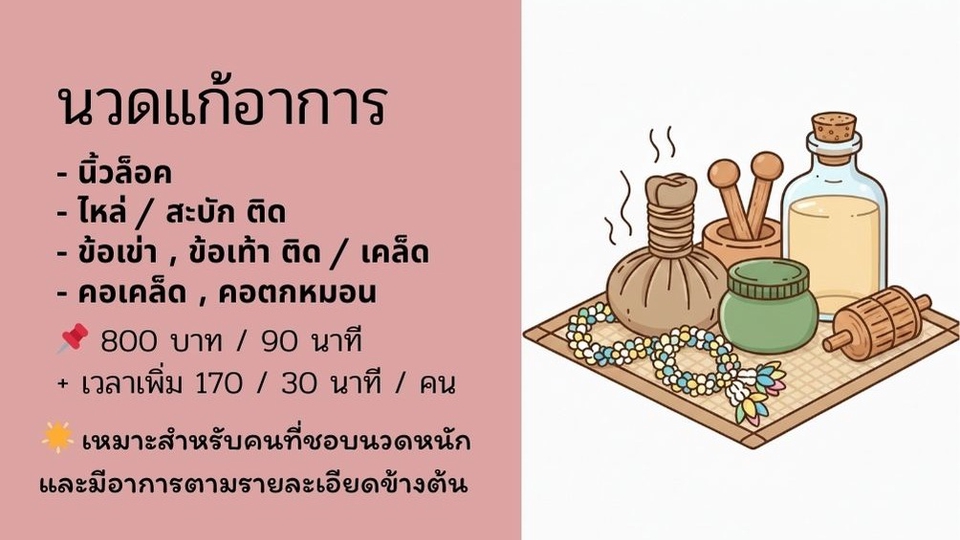 ฿800นวดแก้อาการ - นิ้วล็อค - ไหล่ / สะบัก ติด - ข้อเข่า , ข้อเท้า ติด / เคล็ด - คอเคล็ด , คอตกหมอน 📌 800 บาท / 90 นาที + เวลาเพิ่ม 170 / 30 นาที / คน 🌟 เหมาะสำหรับมีอาการตามรายละเอียดข้างต้น
