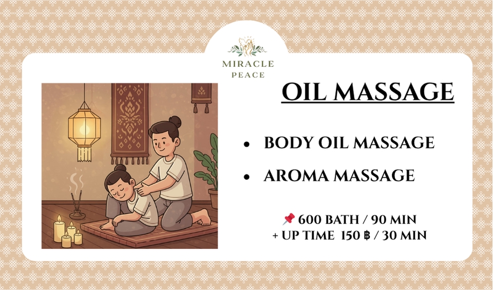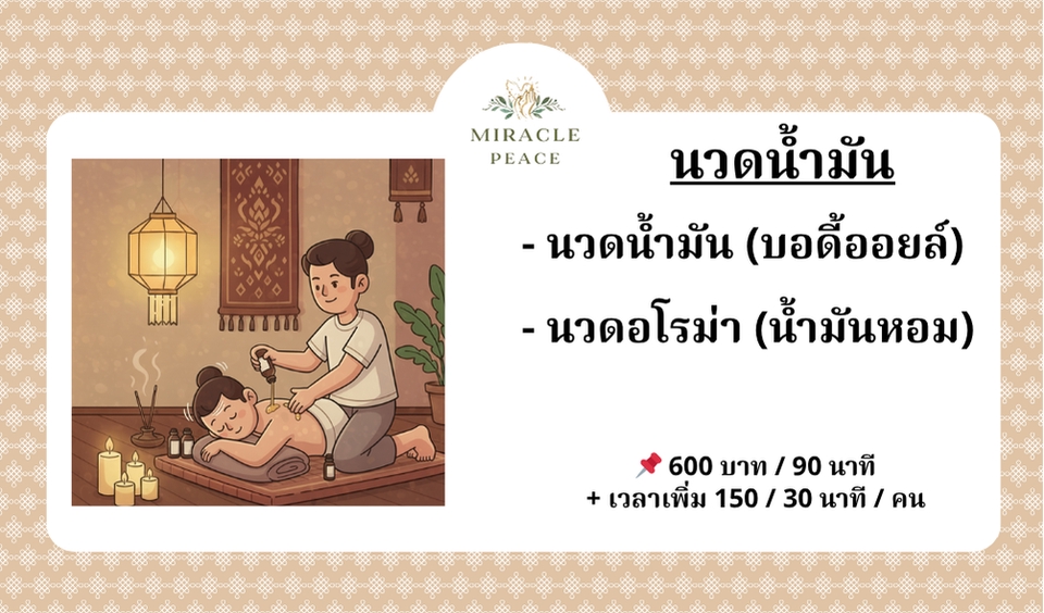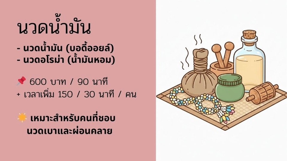 ฿600- นวดน้ำมัน (บอดี้ออยล์) - นวดอโรม่า (น้ำมันหอม) 📌 600 บาท / 90 นาที + เวลาเพิ่ม 150 / 30 นาที / คน 🌟 เหมาะสำหรับคนที่ชอบ นวดเบาและผ่อนคลาย 🚄เดินทางฟรีตามแนวรถไฟฟ้าในเขตพื้นที่ จ.นนทบุรี