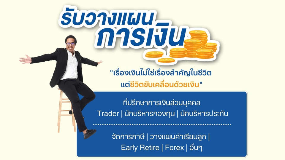 ให้คำปรึกษาการวางแผนการเงินครบทุกด้าน: 1. งบการเงินส่วนบุคคล งบกระแสเงินสด 2. วางแผนความเสี่ยง ประกันต่างๆ 3. วางแผนการลงทุน 4. วางแผนเกษียณ 5. วางแผนภาษี 6. วางแผนมรดก ขั้นตอนการทำงาน 1. รวบรวมข้อมูล 2. ทำแผนการเงิน 3. นำมาปรึกษา เพื่อปรับปรุงแผน 4. วางขั้นตอนการทำตามแผน 5. สรุป