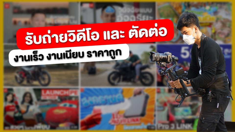 ฿6,000วิดิโอโฆษณา หรือ Review ความยาวไม่เกิน 3-5 นาที รายละเอียด 1. วางแผนในการถ่ายทำ 2. ทีมถ่ายทำกล้อง 1 ตัว Mic Wireless 1 คิว (8 ชม. พัก 1 ชม.) (ถ่ายอย่างเดียว 4,000) เก็บ Footage การใช้งาน และอื่นๆ 3. ตัดต่อวิดิโอความยาวไม่เกิน 5 นาที (ตัดอย่างเดียว 3,000) (เกิน 5 นาที เพิ่มนาทีละ 500.-) 4. ตัดต่อคลิป 3 - 7 วัน / คลิป 5. แก้ไขฟรี 3 ครั้ง (ครั้งถัดไป 500/ครั้ง) ส่งไฟล์วีดีโอ H264 .MP4 (Full HD / 4K) (ถ่ายรวมตัด 6,000)(ราคาถ่ายแบบส่งสินค้า)