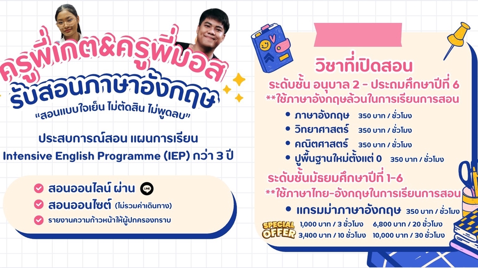 สวัสดีค่า ครูพี่เกต ครูพี่มอส เปิดรับสอนพิเศษภาษาอังกฤษแล้วค่าา สำหรับคนที่ต้องการฝึกทักษะการฟัง พูด อ่าน เขียน หรืออยากเพิ่มความมั่นใจในการใช้ภาษาอังกฤษ มานี่มาา คุณครูมี 2 ท่านนะคะ จบครุศาสตร์ภาษาอังกฤษโดยตรง มีประสบการณ์สอนแผนการเรียน Intensive English Programme (IEP) ตั้งแต่ระดับชั้นอนุบาลถึงมัธยมศึกษาปีที่ 6 กว่า 3 ปี เลยค่า “เราสอนแบบใจเย็น เข้าใจธรรมชาติเด็ก ไม่ตัดสิน ไม่พูดลบ” มีบริการสอนทั้งแบบ online และ onsite ระดับชั้นอนุบาล 2 - ประถมศึกษาปีที่6 ใช้ภาษาอังกฤษล้วนในการเรียนการสอน เปิดสอนวิชา... ภาษาอังกฤษ /วิทยาศาสตร์/ คณิตศาสตร์ ตลอดจนปูพื้นฐานใหม่ตั้งแต่ 0 ระดับชั้นมัธยมศึกษาปีที่ 1-6 ใช้ภาษาไทย-อังกฤษในการเรียนการสอน เปิดสอนวิชา... แกรมม่าภาษาอังกฤษ โดยแต่ละวิชาทุกระดับชั้น คุณครูจะสอนบทสนทนาเพื่อใช้ในชีวิตประจำวันให้ก่อนเข้าเนื้อหาทุกวิชาเลยค่า ขั้นตอนการทำงาน 1. คุยรายละเอียดความต้องการ 2. ลงเวลาเรียน 3. เข้าเรียนตามนัดหมาย 4. คุณครูสรุปความก้าวหน้ารายงานผู้ปกครอง