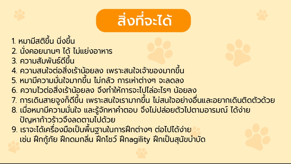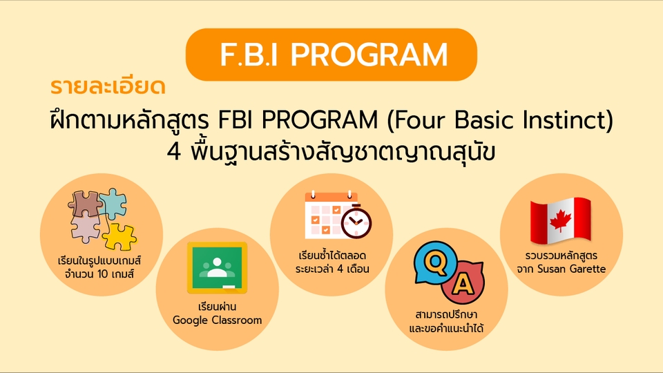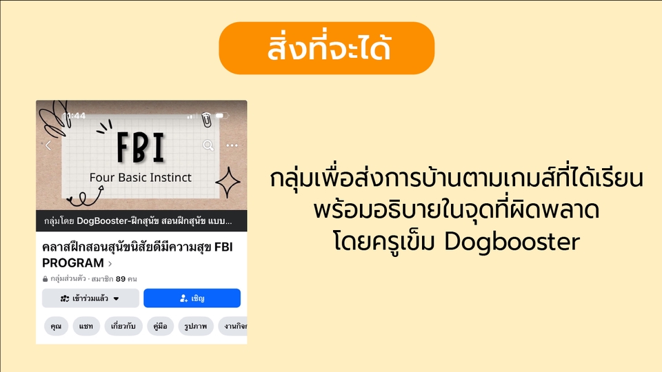 คอร์สเรียนออนไลน์ฝึกตามหลักสูตร FBI PROGRAM (Four Basic Instinct) 4 พื้นฐานสร้างสัญชาตญาณสุนัข เหมาะกับ -ผู้เลี้ยงที่ได้สุนัขตัวใหม่ -ผู้เลี้ยงต้องการศึกษาเพิ่มเติม -ผู้เลี้ยงต้องการเครื่องมือในการสอนสุนัขแบบไม่ลงโทษ -ผู้เลี้ยงที่ต้องการสร้างความสัมพันธ์ที่ดีให้สุนัข สุนัขจะรักเจ้าของมากขึ้น สิ่งที่จะได้ 1. หมามีสติขึ้น นิ่งขึ้น 2. นั่งคอยนานๆ ได้ ไม่แย่งอาหาร 3. ความสัมพันธ์ดีขึ้น 4. ความสนใจต่อสิ่งเร้าน้อยลง เพราะสนใจเจ้าของมากขึ้น 5. หมามีความมั่นใจมากขึ้น ไม่กลัว การเห่าต่างๆ จะลดลง 6. ความไวต่อสิ่งเร้าน้อยลง จึงทำให้การจะไปไล่อะไรๆ น้อยลง 7. การเดินสายจูงก็ดีขึ้น เพราะสนใจเรามากขึ้น ไม่สนใจอย่างอื่นและอยากเดินติดตัวด้วย 8. เมื่อหมามีความมั่นใจ และรู้จักหาคำตอบ จึงไม่ปล่อยตัวไปตามอารมณ์ ได้ง่าย ปัญหาก้าวร้าวจึงลดตามไปด้วย 9. เราจะได้เครื่องมือเป็นพื้นฐานในการฝึกต่างๆ ต่อไปได้ง่าย เช่น ฝึกกู้ภัย ฝึกดมกลิ่น ฝึกโชว์ ฝึกagility ฝึกเป็นสุนัขบำบัด
