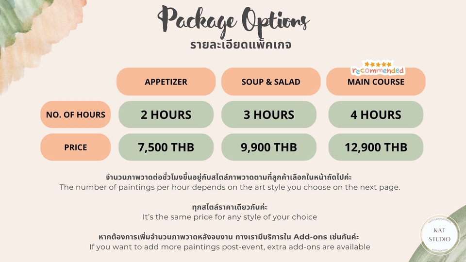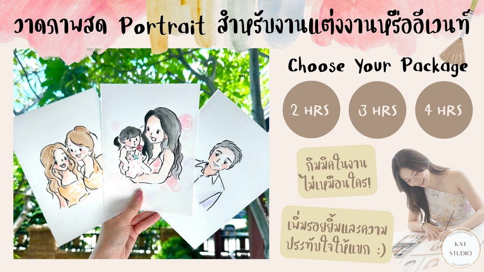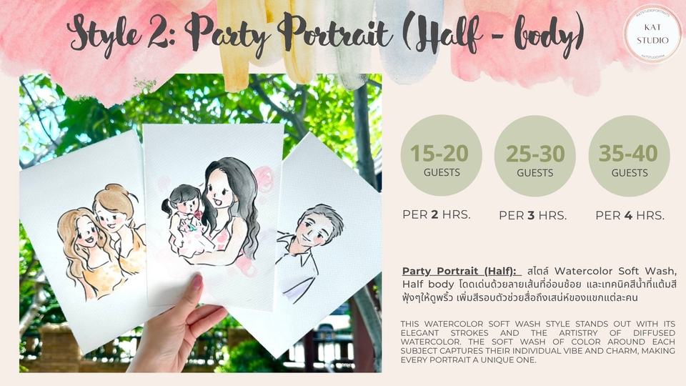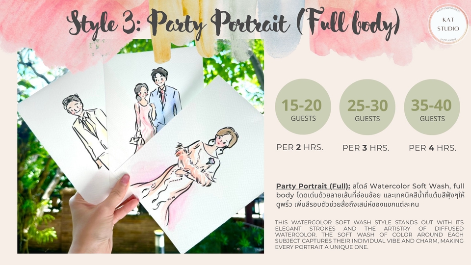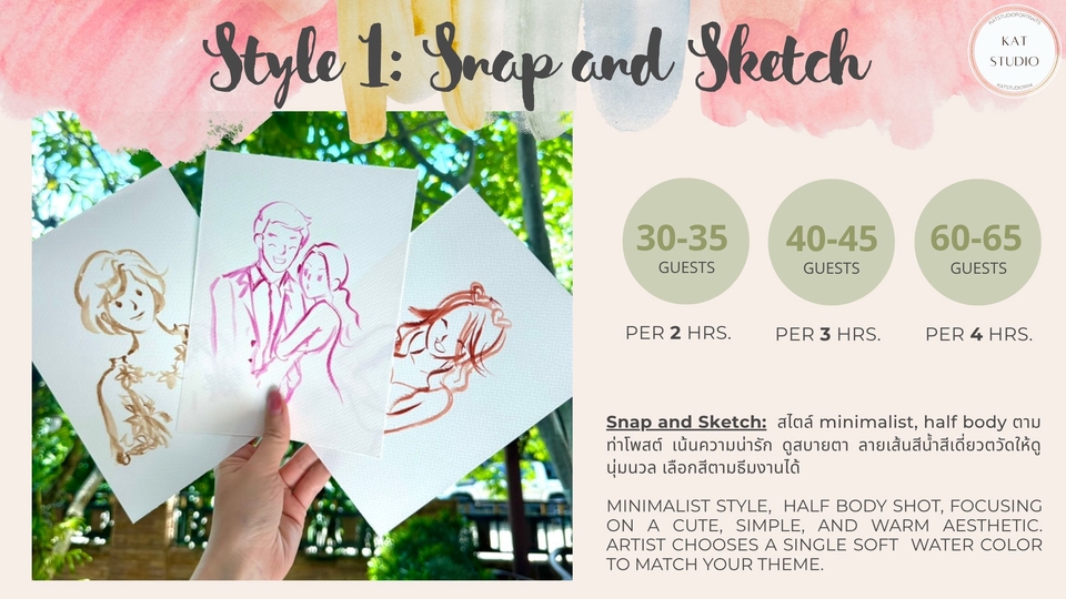 ฿7,500ลูกค้าสามารถเลือกสไตล์การวาดได้ 3 แบบ 1) Snap and Sketch 2) Party Portrait (Half body) 3) Party Portrait (Full body)