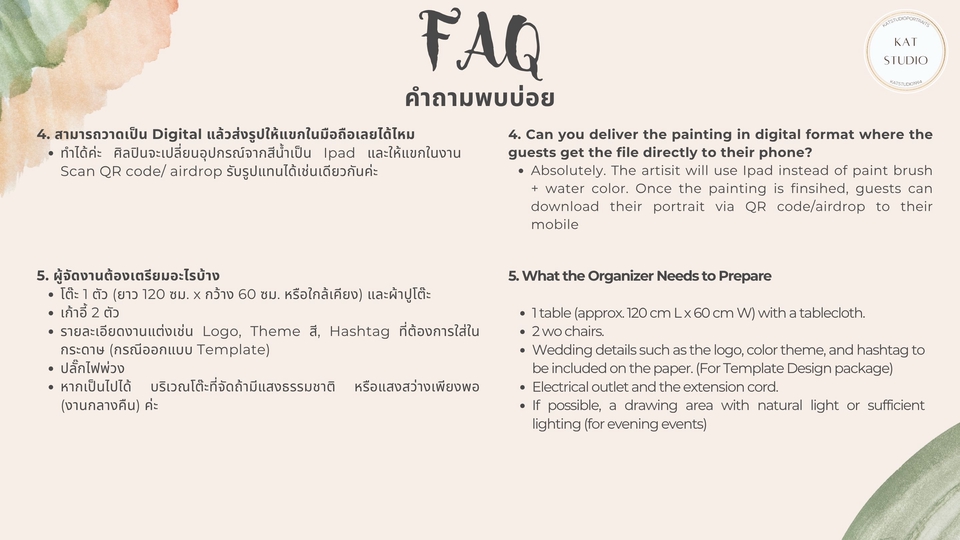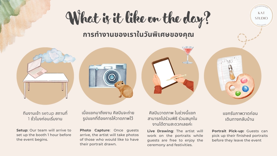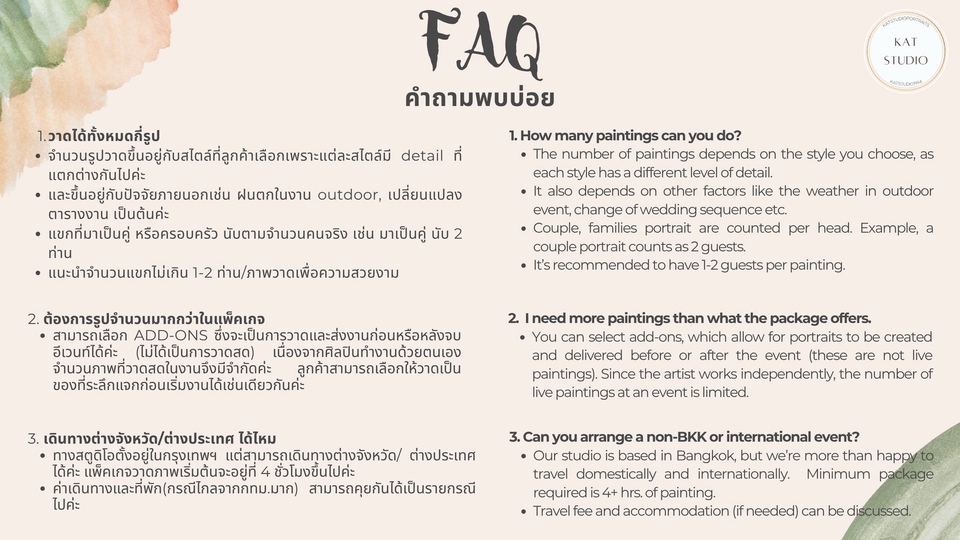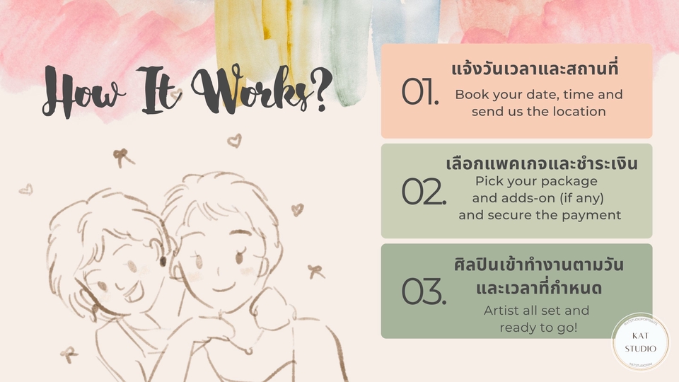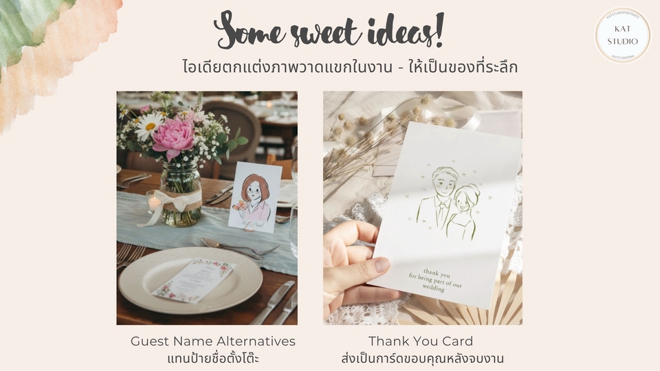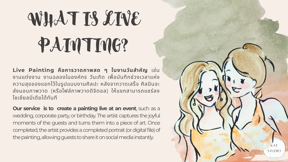 Guest Live Painting วาดภาพสด สำหรับแขกในงานต่างๆ เช่น งานแต่งงาน งานปาร์ตี้ งานฉลองในองค์กร วันเกิด เพื่อบันทึกช่วงเวลาแห่งความสุขของแขกไว้ในรูปแบบงานศิลปะ หลังจากวาดเสร็จ ศิลปินจะส่งมอบภาพวาด (หรือไฟล์ภาพวาดดิจิตอล) ให้แขกสามารถนำกลับไปเป็นของที่ระลึก หรือแชร์ลง social media ได้ ลูกค้าสามารถเลือก Package ตามระยะเวลาที่ต้องการ ตั้งแต่ 2-4 ชั่วโมง และเลือกสไตล์การวาด (ที่จะมีผลต่อจำนวนภาพวาด) ศิลปินใช้สีน้ำเป็นหลัก (หรือส่งมอบเป็น Digital file ใช้ Ipad) สามารถสอบถามเพิ่มเติมได้เลยค่ะ ศิลปินจะเข้าวาดภาพสดๆในงานของลูกค้า เป็นกิจกรรมให้กับแขกในงานได้ร่วมสนุก ถ่ายรูป แลกกับเพื่อนดู ถ่ายลงโซเชียล เป็นอีกหนึ่งความประทับใจในงานวันสำคัญของคุณลูกค้าค่ะ :)