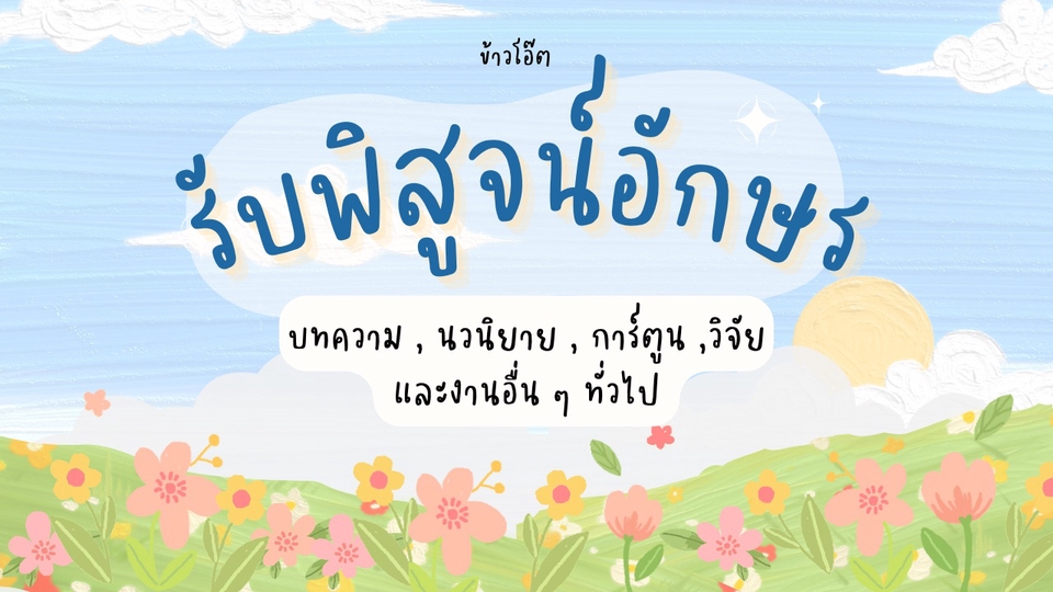 - จบการศึกษาจาก คณะศิลปศาสตร์ สาขาวิชาภาษาไทยค่ะ 😊 - รับพิสูจน์อักษร บทความต่าง ๆ บทความ , วิจัย , นิยาย , การ์ตูน หรืองานอื่น ๆ - ระยะเวลาขึ้นอยู่กับความยาวของเนื้อหาค่ะ - ขนาด A4 ราคาหน้าละ 10 บาท - ขนาด A5 ราคาหน้าละ 5 บาท 😊 ขั้นตอนการทำงาน 1. รับงาน คุยรายละเอียดที่ต้องการ 2. ดูเนื้อหา และบอกระยะเวลาที่ต้องการ 3. จัดทำงานที่ต้องการ และส่งงาน