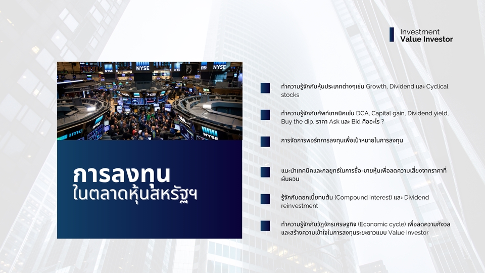 สอนการลงทุนในตลาดหุ้นสหรัฐฯสไตล์ Value Investor & การเงินส่วนบุคคลขั้นพื้นฐาน สไตล์เพื่อนให้คำแนะนำเพื่อน การเงินส่วนบุคคล • รายได้เยอะ แต่ทำไมถึงยังไม่มีเงินเก็บ ? • การทำบัญชีรายรับ-รายจ่ายจะช่วยเปลี่ยนชีวิตได้จริงเหรอ ? • เงินทุนสำรองเลี้ยงชีพ (Emergency fund) ที่ดีต้องมีกี่เดือน ? • มีภาระหนี้สินแต่อยากลงทุน ควรเริ่มจากตรงไหนก่อนดี ? สิ่งที่ผู้เรียนจะได้รับจากการเรียนคอร์สการเงินส่วนบุคคลขั้นพื้นฐาน • แนะนำการทำบัญชีรายรับ-รายจ่ายเพื่อทำความเข้าใจสภาพคล่องของตนเอง • ทำความรู้จักกับ Provident fund, Emergency fund เพื่อวางแผนด้าน การเงิน • การบริหารรายรับ-รายจ่ายเพื่อการเก็บเงินสำรองฉุกเฉิน, การลงทุนและการแก้หนี้ • ช่วยวางแผนทางด้านการเงินเพื่อการลงทุนและเป้าหมายต่างๆ คอร์สการลงในตลาดหุ้นสหรัฐฯฉบับ Value Investor • ทำความรู้จักกับหุ้นประเภทต่างๆเช่น Growth, Dividend และ Cyclical stocks • ทำความรู้จักกับศัพท์เทคนิคเช่น DCA, VA, Capital gain, Dividend yield, Buy the dip, ราคา Ask และ Bid คืออะไร ? • การจัดการพอร์ทการลงทุนเพื่อเป้าหมายในการลงทุน • เทคนิคและกลยุทธ์ในการซื้อ-ขายหุ้นเพื่อลดความเสี่ยงจากราคาที่ผันผวน • รู้จักกับดอกเบี้ยทบต้น (Compound interest) และ Dividend reinvestment • ทำความรู้จักกับวัฏจักรเศรษฐกิจ (Economic cycle) เพื่อลดความกังวลและสร้างความเข้าใจในการลงทุนระยะยาวแบบ Value Investor เนื้อหาทั้งหมด ผมจะสอนด้วยสไตล์เพื่อนที่ให้คำแนะนำเพื่อน เพื่อลดความเครียดและช่วยให้เข้าใจได้ง่ายขึ้น