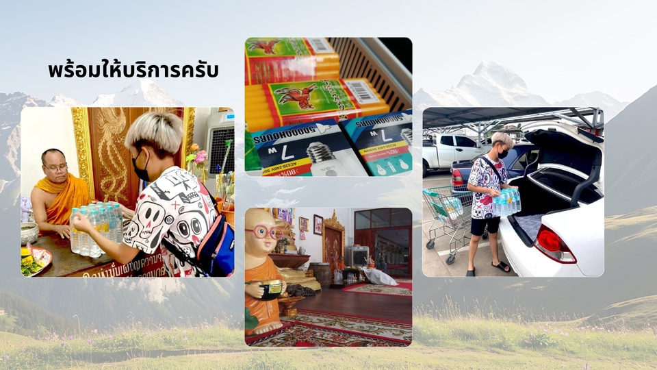 - • ภาพถ่ายขณะทำบุญแต่ละกิจกรรม จัดส่งพร้อมคำอธิบายประกอบ