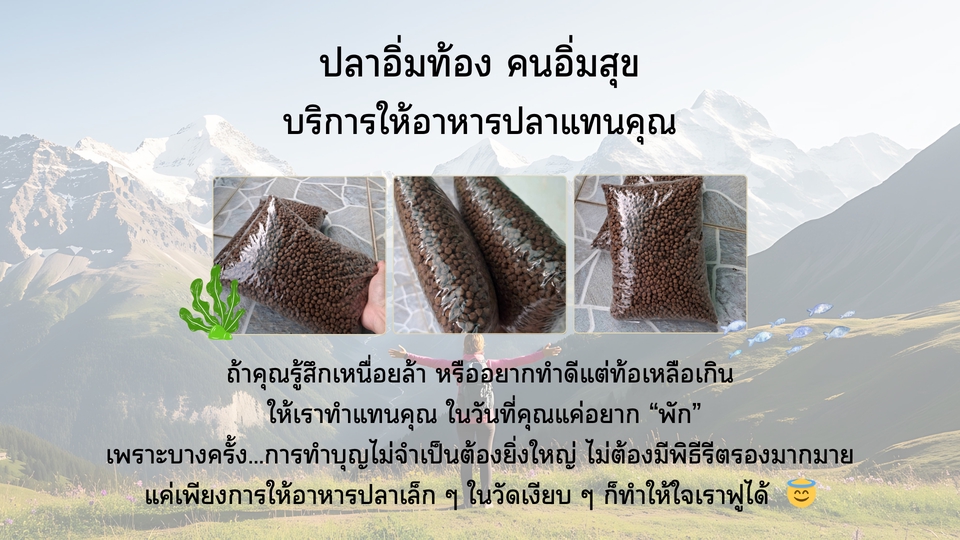 - • บุญกุศลครบ 4 มิติ (ให้อาหารปลา/ปล่อยปลา/บริจาคโลงศพ/ถวายสังฆทาน)