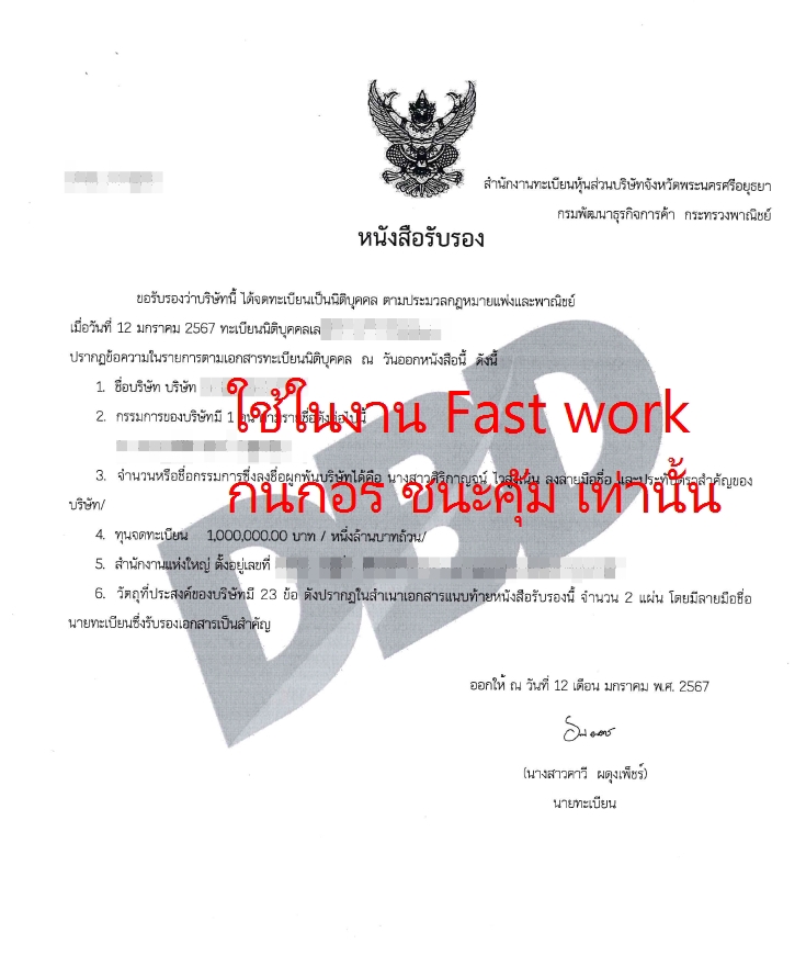 รับจดทะเบียน บริษัท จำกัด ห้างหุ้นส่วนจำกัด แก้ไขเปลี่ยนแปลงทะเบียน กับกรมพัฒนาธุรกิจการค้า เพิ่มทุน ลดทุน เปลี่ยนแปลงกรรมการ / เปลี่ยนผู้ถือหุ้น เพิ่ม - ลดวัตถุประสงค์ รับยื่นผ่านระบบ รับจดทะเบียนนิติบุคคลผ่านอิเล็คทรอนิกส์เท่านั้น ขั้นตอนการทำงานสำหรับ จดทะเบียนนิติบุคคล 1. เมื่อลูกค้าเลือกแพ็คเกจ จัดส่ง ไฟล์ เพื่อขอข้อมูลลูกค้า 2. เมื่อได้รับไฟล์ตอบกลับจากลูกค้า ดำเนินการกรอกเอกสารในระบบ 3. เมื่อกรอกเสร็จ ส่งให้เจ้าหน้าที่ตรวจสอบ หากไม่ผ่าน แก้ไขทันที่ 4. หากเอกสารผ่าน ติดต่อลูกค้า เพื่อเตรียม ยื่นยันตัวตนและลงลายมือชื่อผ่านระบบ 5. เมื่อลูกค้าลงลายมือชื่อ รอนายทะเบียนอนุมัติ 6. เมื่อนายทะเบียนอนุมัติ ขอคัดเอกสารหลักฐาน ส่งให้กับลูกค้า ขั้นตอนการทำงาน 1. เมื่อลูกค้าเลือกแพ็คเกจ จัดส่ง ไฟล์ เพื่อขอข้อมูลลูกค้า 2. เมื่อได้รับไฟล์ตอบกลับจากลูกค้า ดำเนินการกรอกเอกสารในระบบ 3. เมื่อกรอกเสร็จ ส่งให้เจ้าหน้าที่ตรวจสอบ หากไม่ผ่าน แก้ไขทันที่ 4. หากเอกสารผ่าน ติดต่อลูกค้า เพื่อเตรียม ยื่นยันตัวตนและลงลายมือชื่อผ่านระบบ 5. เมื่อลูกค้าลงลายมือชื่อ รอนายทะเบียนอนุมัติ 6. เมื่อนายทะเบียนอนุมัติ ขอคัดเอกสารหลักฐาน ส่งให้กับลูกค้า