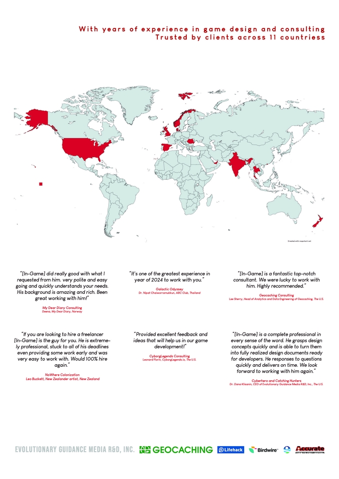 รับออกแบบทุกแนวเกม ไม่ว่าจะเป็น บอร์ดเกม เกมออนไลน์ เกมิฟิเคชัน และเกมเพื่อใช้สำหรับการศึกษา ผมมีประสบการณ์ออกแบบเกม 6 ปีทั้งในและต่างประเทศ และจบการศึกษาปริญญาโทโดยตรงของ Game Studies ประเทศฟินแลนด์ บริการนี้พร้อมให้บริการ 1. การออกแบบเกมตั้งแต่ต้นจนจบโปรเสสการสร้าง 2. การออกแบบที่ต่อยอดจากแนวคิดของลูกค้าที่มี เพื่อส่งต่อให้ Artist และ Developer ดำเนินการต่อ ขอบเขตการให้บริการ - Game World Setting Design - Game Mechanic Design - Game Narrative Design - Game Balancing and Economy Design - Level Design - รวมถึงการสร้าง Framework เพื่อการพัฒนาต่อยอดได้ด้วยตนเองสำหรับลูกค้า สิ่งที่จะได้รับคือ - GDD - หนังสือกฎการเล่นเกมสำหรับผู้เล่น (UX-based) - ไฟล์ Prototype เพื่อสื่อภาพการเล่นล่าสุดจาก Playtesting ขั้นตอนการทำงาน 1. ลูกค้าบอกสิ่งที่คาดหวัง แนวคิด หรือเป้าหมายของเกม หรือเกมิฟิเคชันที่อยากทำ (หากมีเกมในดวงใจที่ใช้เป็น reference) สามารถส่งมาได้ด้วยครับ 2. นัดคุยกันหนึ่งครั้งผ่านระบบเพื่อกำหนดขอบเขตที่ชัดเจน และกำหนดเวลาการอัพเดตงาน 3. งานจะเริ่มด้วย ideation process ส่งมอบงานเป็นไอเดีย 3 ไอเดีย ที่ล้อกับเป้าหมายเพื่อให้ลูกค้าเลือกไอเดียที่จะทำต่อ 4. ลูกค้าใช้เวลา Feedback กลับมา (สามารถข้ามได้ หากไม่ต้องการ Feedback) 5. งานจะต่อด้วยการนำไอเดียที่เลือกพัฒนาจนเป็นเกมที่เล่นได้ และทดสอบรอบที่ 1 6. งานจะถูกส่งมอบให้ลูกค้าตรวจสอบเพื่อ Feedback กลับมา 7. งานจะต่อด้วยการพัฒนาและเข้าสู้การทดสอบเกมรอบที่ 2-5 (แล้วแต่แพคเกจ) 8. งานจะถูกส่งมอบให้ลูกค้าตรวจสอบเพื่อ Feedback กลับมา 9. งานจะถูกส่งมอบผ่านไฟล์ 3 ประเภทที่ได้แจ้งไว้ 10. ลูกค้าสามารถสอบถามหรือ Feedback ได้รอบสุดท้าย หากไม่มีถือว่างานสำเร็จ
