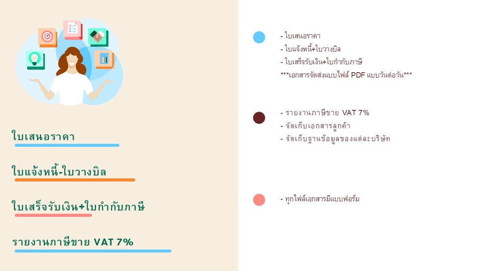 ฿4,000- ใบเสนอราคา - ใบแจ้งหนี้+ใบวางบิล - ใบเสร็จรับเงิน+ใบกำกับภาษี ***เอกสารจัดส่งแบบไฟล์ PDF แบบวันต่อวัน*** - รายงานภาษีขาย VAT 7% - จัดเก็บเอกสารลูกค้า - จัดเก็บฐานข้อมูลของแต่ละบริษัท