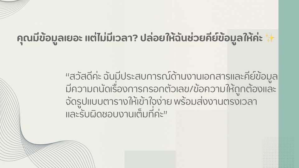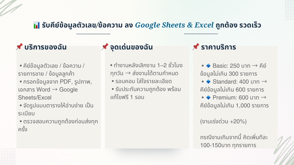📊 รับคีย์ข้อมูลตัวเลข/ข้อความ ลง Google Sheets และ Excel รวดเร็ว ถูกต้อง หาก คุณกำลังปวดหัวกับงานเอกสาร ข้อมูลเยอะจนจัดการไม่ไหวใช่ไหม? ฉันรับบริการคีย์ข้อมูลตัวเลข ข้อความ รายการขาย หรือข้อมูลลูกค้า ลงใน Google Sheets/Excel ให้เรียบร้อย ✅ • คีย์ข้อมูลถูกต้อง รวดเร็ว • จัดรูปแบบให้สวยงาม อ่านง่าย • รับงานด่วน งานประจำ งานครั้งเดียวก็ได้ -------------------------- ผู้ว่าจ้าง: …………… ฟรีแลนซ์ (ผู้รับจ้าง): …………… 1. งานที่รับ: คีย์ข้อมูลตัวเลข/ข้อความ ลงใน Google Sheets หรือเอกสารที่ผู้ว่าจ้างกำหนด 2. ปริมาณงาน: (เช่น 500 รายการต่อไฟล์) 3. ระยะเวลา: ส่งงานภายใน … วัน/ชั่วโมง หลังจากได้รับไฟล์ 4. ราคาค่าจ้าง: ……… บาท/งาน (ถ้างานเกินขอบเขต คิดเพิ่มตามตกลง) 5. การส่งมอบ: ส่งลิงก์ Google Drive/Google Sheets ให้ตรวจสอบ 6. การแก้ไข: ฟรี 1 รอบ หากเป็นความผิดพลาดจากผู้รับจ้าง 7. การชำระเงิน: ผ่านระบบ Fastwork/โอนตรง ตามที่ตกลง --------- หมายเหตุ: • หากงานเร่งด่วน (เช่น ต้องการภายใน 24 ชม.) → คิดเพิ่ม 20% • หากเกินจำนวนที่กำหนด คิดเพิ่ม 100–150 บาท ต่อทุก 200 รายการ • สามารถแก้ไขงานได้ฟรี 1 รอบ หากเป็นความผิดพลาดของผู้รับจ้าง