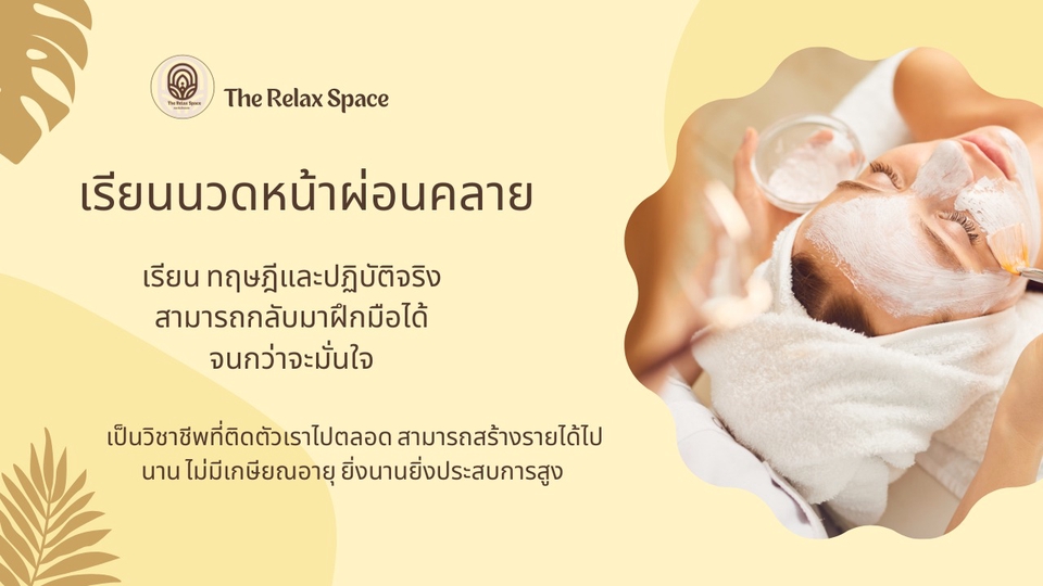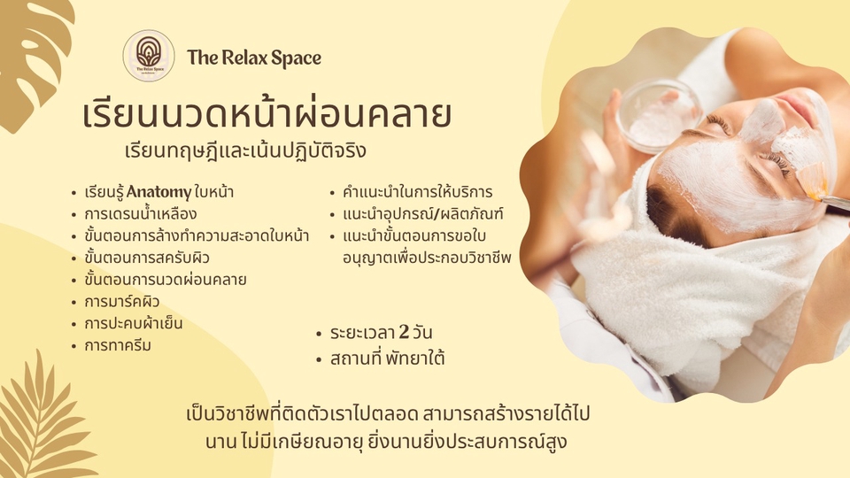 เรียนนวดหน้าผ่อนคลาย หลักสูตรกระชับ เข้าใจง่าย ปฏิบัติได้ไวภายใน 2วัน เรียนทั้งทฤษฎีและปฏิบัติ นักเรียนสามารถกลับมาฝึกซ้อมมือได้จนกว่าจะมั่นใจ วิชาชีพที่ไม่มีเกษียณอายุ สามารถประกอบอาชีพได้อีกยาวนาน ยิ่งอายุมากขึ้นประสบการณ์ยิ่งเยอะ ผลงานดีมีแต่ลูกค้าประจำ นักเรียนจะได้รับ 1.คู่มือการเรียนการสอน กล้ามเนื้อต่างๆบนใบหน้า 2.ขั้นตอนการล้างหน้า 3.การนวดหน้า 4.การกดจุดบนใบหน้า 5.การกดจุดศรีษะ 6.การนวดศรีษะผ่อนคลาย 7.การนวดมือ คอ บ่า ไหล่ 8.มารยาทในการบริการ 9.เคล็ดลับมัดใจลูกค้า 10.การทำการตลาด 11.การทำภาพโฆษณา *** ปรึกษาได้ตลอด
