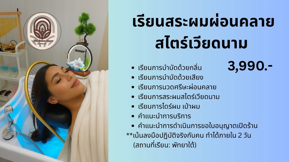 สอนสระผมผ่อนคลาย สไตร์เวียดนาม สามารถเรียนและลงมือปฏิบัติจริงจนทำเป็นได้ภายใน 2 วัน หากยังไม่มั่นใจสามารถกลับมาฝึกต่อได้จนกว่าจะคล่อง ครูจะแนะนำวิธีการและเทคนิคต่างๆ ที่ทำให้ลูกค้าประทับใจ รวมไปถึงสามารถปรึกษาเรื่องการทำการตลาด การทำภาพสวยๆได้อีกด้วย รับลูกค้าแค่ 3คน ใช้เวลาราวๆ 4ชั่วโมง ก็ได้ค่าเรียนคืนแล้ว และเป็นวิชาชีพติดตัวไปตลอด