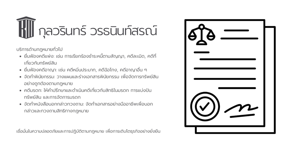 รับปรึกษาปัญหาทางกฎหมาย และดำเนินการทางกฎหมาย แพ่ง อาญา เทคโนโลยี รวมถึงสามารถช่วยวางแผนภาษี