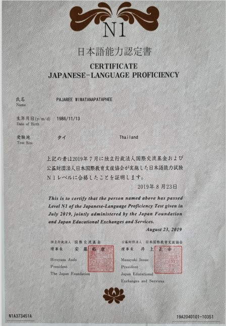 จบเอกภาษาญี่ปุ่นทั้งปริญญาตรีและโท และเรียนต่อที่ประเทศญี่ปุ่นเป็นเวลา 2 ปี และมีประสบการณ์เป็นล่ามในบริษัทญี่ปุ่น 10 ปี สามารถแปลเอกสารที่เกี่ยวข้องในบริษัทญี่ปุ่น เช่น work standard, machine Specification,เอกสารเกี่ยวข้องกับงานด้าน HR,GA, Safety, Accounting ประเมินระยะเวลาและค่าจ้างจากตัวอย่างของงาน นำเสนอระยะเวลาและใบเสนอราคา หลังจากตกลงกันทั้ง 2 ฝ่ายแล้วจึงจะเริ่มทำงาน มีรายงานความคืบหน้าเป็นระยะๆ