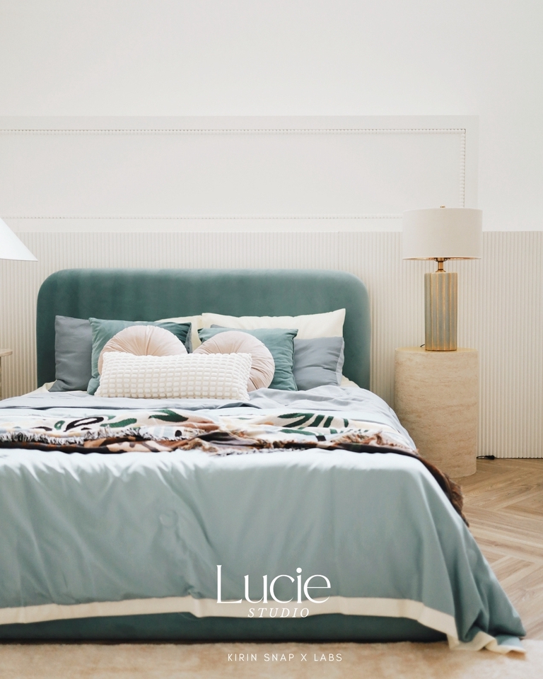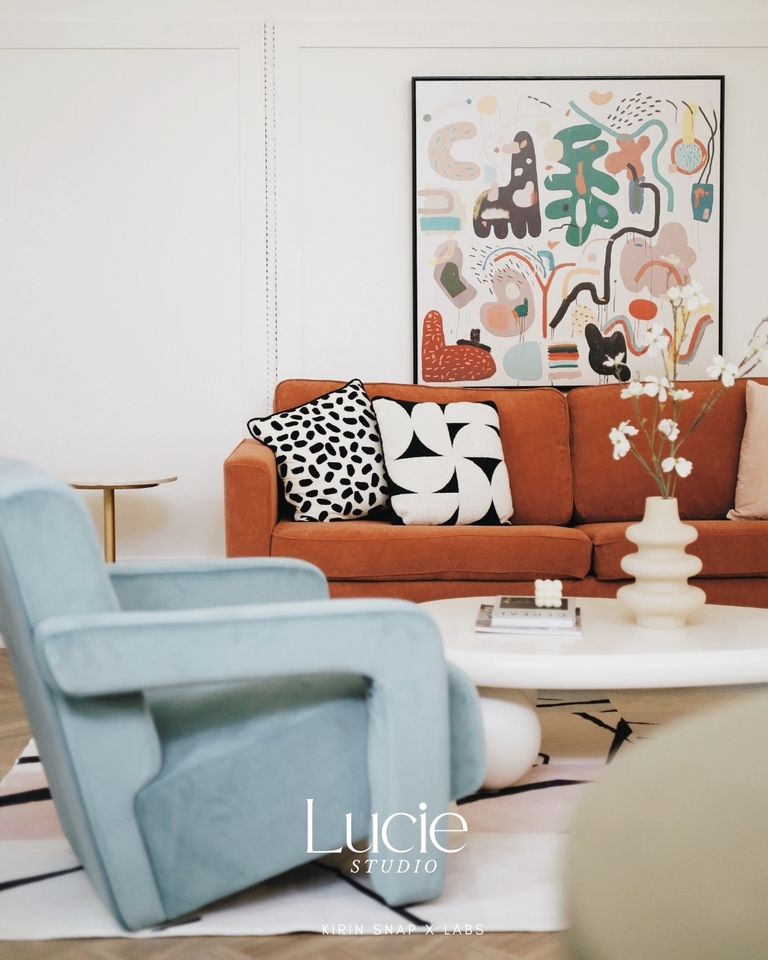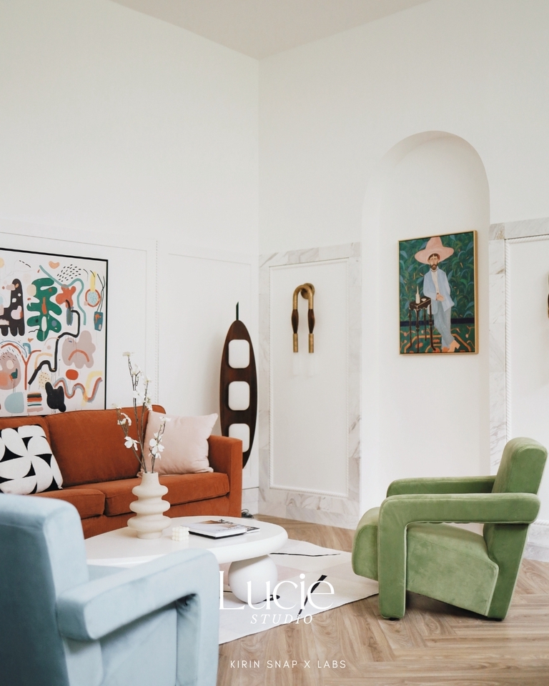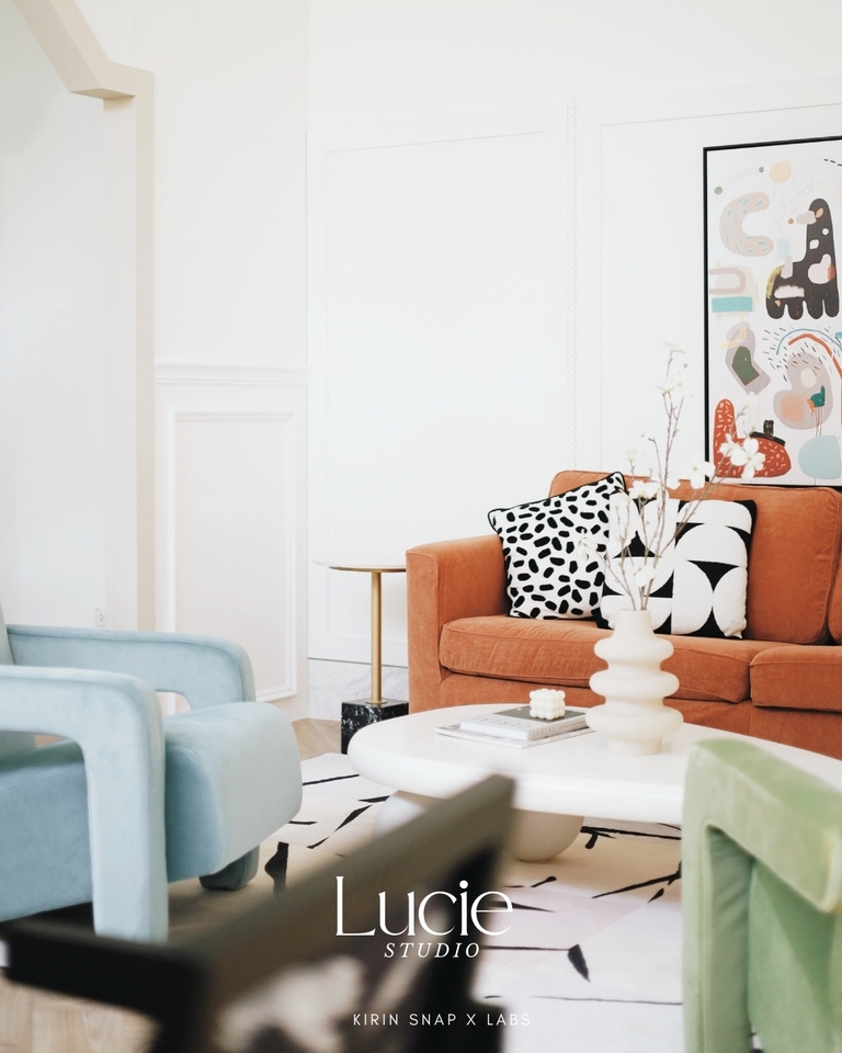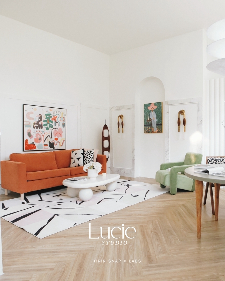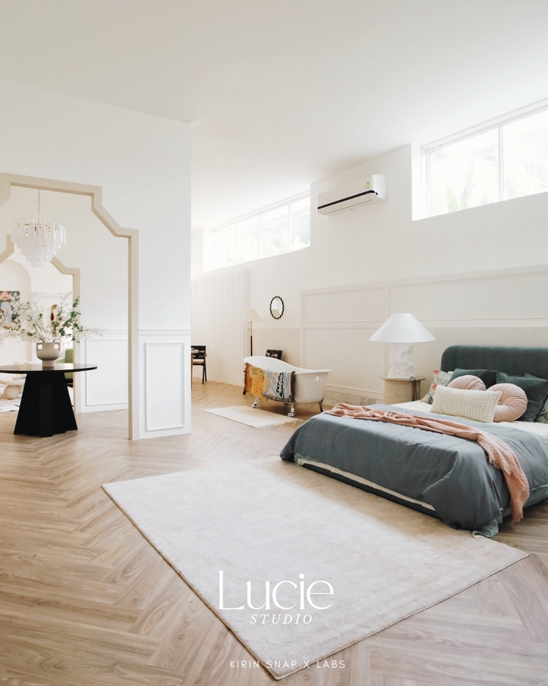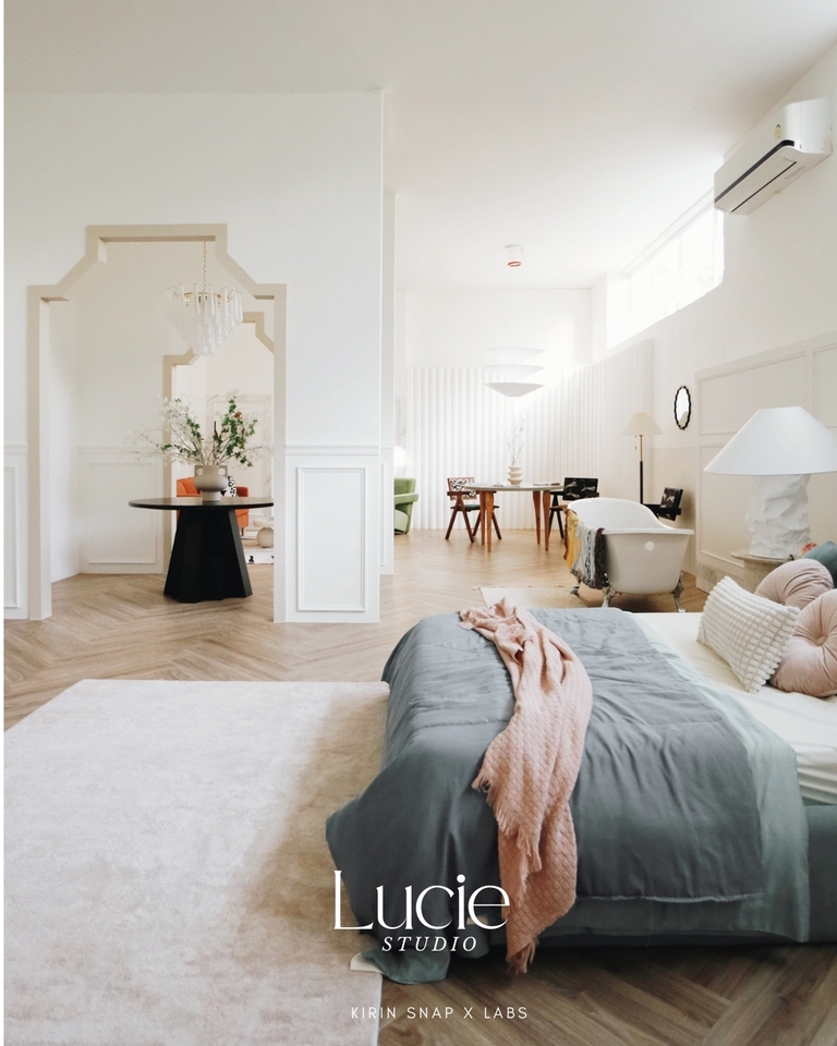 KIRIN snap x labs ให้เช่าสตูดิโอโทนขาว ตัดกับเฟอร์สี 🛋️แนวบ้านดาราฮอลลีวูด ดูสดใส มีชีวิตชีวา และยังคงให้ลุค luxury ไม่มีตกหล่น มีทั้งโซนห้องนอน ห้องนั่งเล่น 🛁อ่างอาบน้ำ โต๊ะทานข้าว โต๊ะทำงาน
