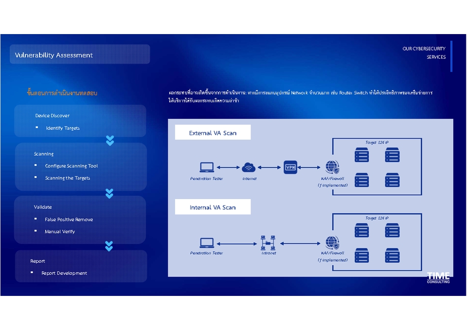 การสแกนหาช่องโหว่ด้วยเครื่องมือแบบอัตโนมัติ (Automated Tool) เพื่อช่วยตรวจสอบระบบ พิจารณาความ เสี่ยง จุดอ่อน และระดับความรุนแรงที่ Attacker สามารถใช้ ประโยชน์จากช่องโหว่ในการโจมตีทางไซเบอร์ (สามารถออกใบกำกับภาษีได้) ขั้นตอนการทำงาน 1. Device Discover 2. Scanning 3. Validate 4. Report