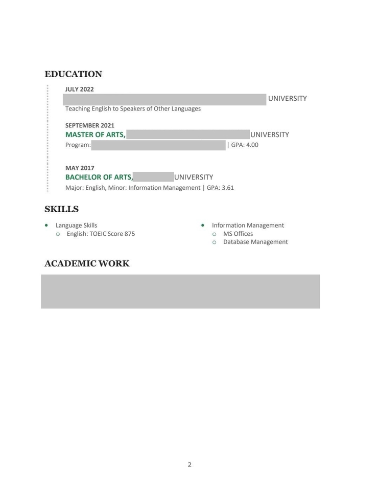 TU-TESOL Certificate (Teaching English to Speakers of Other Languages), Master of Arts in Career English for International Communication, Thammasat University Bachelor of Arts in English, Silpakorn University