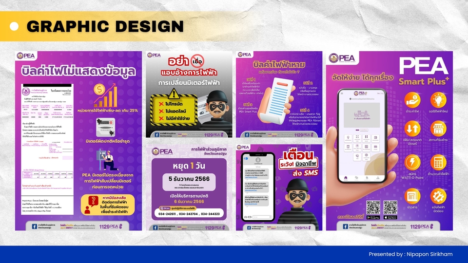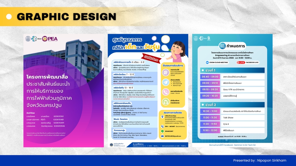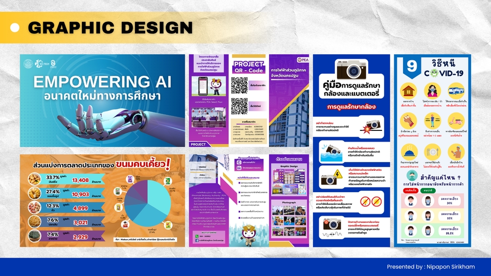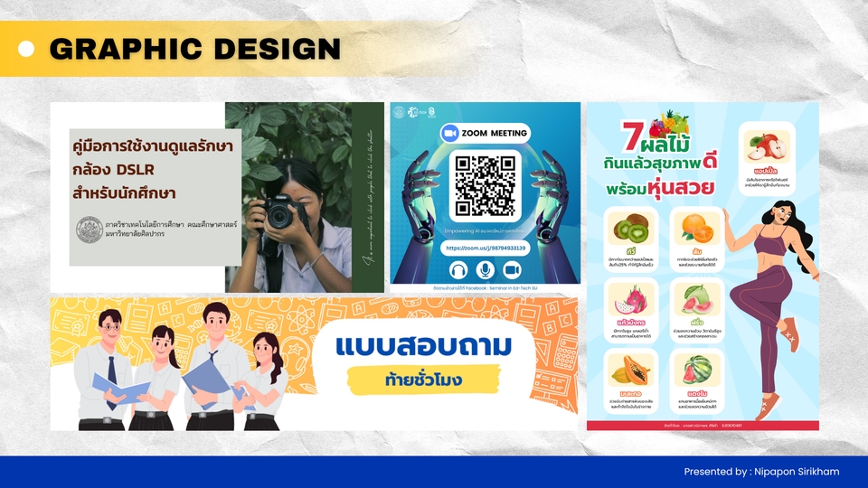 สวัสดีค่ะ ฉันเป็นฟรีแลนซ์สายกราฟิก ดีไซน์เนอร์ ที่มีประสบการณ์ฝึกงานกับการไฟฟ้าส่วนภูมิภาค จ.นครปฐม โดยมีหน้าที่ออกแบบอินโฟกราฟิกและสื่อประชาสัมพันธ์ ถนัดการออกแบบอินโฟกราฟิก โปสเตอร์ และสื่อประชาสัมพันธ์ต่าง ๆ โดยใช้ Canva อย่างคล่องแคล่ว, Adobe Illustrator ในระดับปานกลาง และตัดต่อด้วย Capcut ได้ดี สไตล์งานของฉันคือการใช้สีสันและสัญลักษณ์ในการสื่อสาร เพื่อให้งานเข้าใจง่ายและดึงดูดความสนใจ