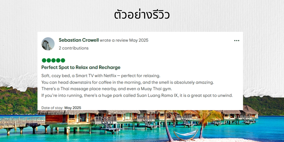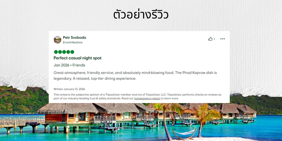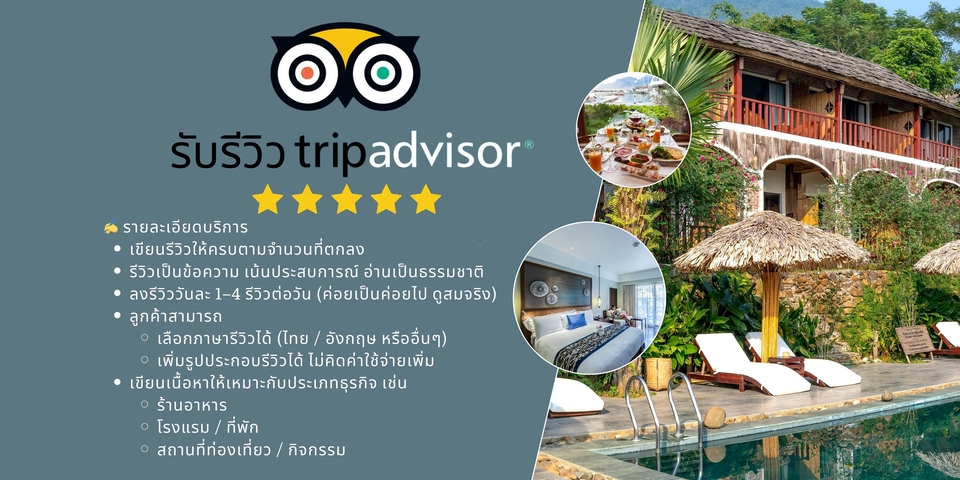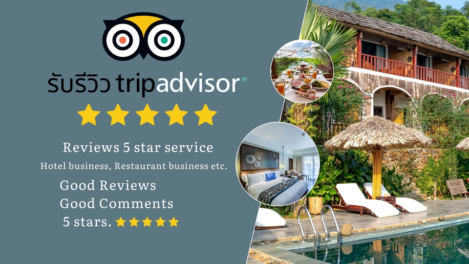 We are offering Tripadvisor reviews service Tripadvisor 5 stars reviews, 5 star Reviews Service, Hotel Business, Restaurant Business Good Reviews Good Comments 🏨 ที่พัก (Hotels & Accommodation) โรงแรม รีสอร์ท โฮสเทล เกสต์เฮ้าส์ อพาร์ตเมนต์ / คอนโดให้เช่า วิลล่า ที่พักแบบโฮมสเตย์ 🍽️ ร้านอาหาร (Restaurants) ร้านอาหารไทย / นานาชาติ คาเฟ่ / ร้านกาแฟ ร้านบุฟเฟต์ ร้านอาหารทะเล ร้านอาหารพื้นเมือง ร้านอาหารมังสวิรัติ / วีแกน บาร์ / ผับ / ร้านนั่งดื่ม 🎡 สถานที่ท่องเที่ยว & กิจกรรม (Things to Do) สถานที่ท่องเที่ยว (วัด, พิพิธภัณฑ์, จุดชมวิว) ชายหาด / ธรรมชาติ สวนสนุก สปา / นวด เวิร์กช็อป / คลาสเรียน ทัวร์ท่องเที่ยว กิจกรรมผจญภัย การแสดง / โชว์ 🧭 บริการท่องเที่ยว (Travel Services) บริษัททัวร์ ไกด์ท้องถิ่น รถเช่า บริการรับส่งสนามบิน เรือท่องเที่ยว ขั้นตอนการทำงาน 1. เราทำงานรีวิวด้วยคนจริงไม่ใช้โปรแกรม 2. เราจะศึกษารายละเอียดของธุรกิจคุณ เช่น สินค้า/บริการ จุดเด่น และกลุ่มเป้าหมาย เพื่อให้รีวิวออกมาเหมาะสมและดูเป็นธรรมชาติมากที่สุด 3. เราจะกำหนดจำนวนรีวิวที่เหมาะสมต่อวัน (1-3 รีวิวต่อวัน) เพื่อให้ดูสมจริงและไม่เร่งรีบเกินไป 4. ทุกรีวิวที่เราสร้าง จะมีเนื้อหาแตกต่างกัน ทั้งในแง่คำพูด น้ำเสียง และรายละเอียด เพื่อป้องกันการซ้ำซ้อน 5. รีวิวที่สมจริง สร้างความน่าเชื่อถือ เพิ่มยอดขาย และดึงดูดลูกค้าใหม่ได้อย่างแน่นอน!