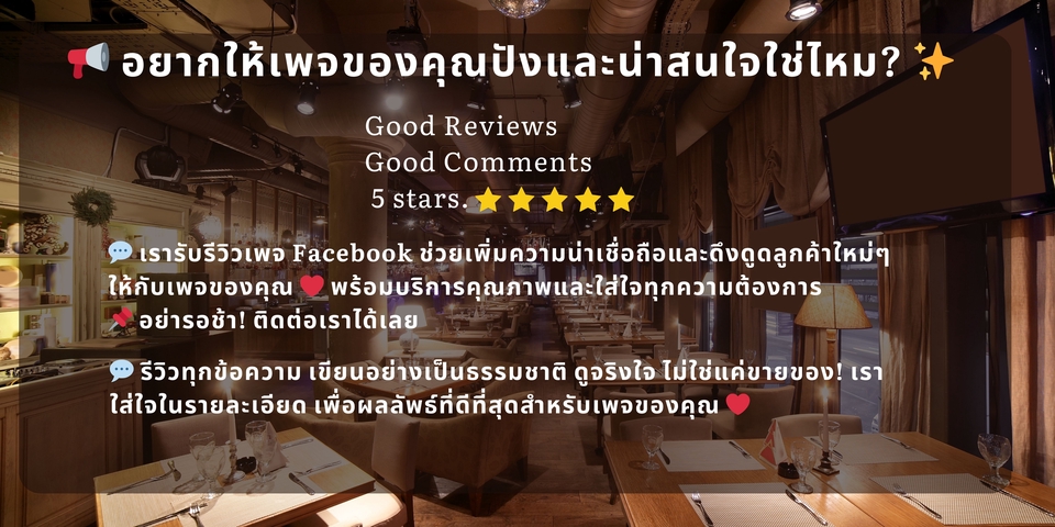 💬 เรารับรีวิวเพจ Facebook ช่วยเพิ่มความน่าเชื่อถือและดึงดูดลูกค้าใหม่ๆ ให้กับเพจของคุณ ❤️ พร้อมบริการคุณภาพและใส่ใจทุกความต้องการ 📌 อย่ารอช้า! ติดต่อเราได้เลย ✨ ทำไมถึงต้องเลือกใช้บริการรีวิวเพจเฟซบุ๊กกับเรา? ✨ - เพิ่มความน่าเชื่อถือ - ดึงดูดลูกค้าใหม่ - เพิ่มการมองเห็น - ช่วยสร้างภาพลักษณ์ที่ดี - ส่งเสริมการขาย 💬 รีวิวทุกข้อความ เขียนอย่างเป็นธรรมชาติ ดูจริงใจ ไม่ใช่แค่ขายของ! เราใส่ใจในรายละเอียด เพื่อผลลัพธ์ที่ดีที่สุดสำหรับเพจของคุณ ❤️ ขั้นตอนการทำงาน 1. เราจะศึกษารายละเอียดของธุรกิจคุณ เช่น สินค้า/บริการ จุดเด่น และกลุ่มเป้าหมาย เพื่อให้รีวิวออกมาเหมาะสมและดูเป็นธรรมชาติมากที่สุด 2. เราจะกำหนดจำนวนรีวิวที่เหมาะสมต่อวัน (1-3 รีวิวต่อวัน) เพื่อให้ดูสมจริงและไม่เร่งรีบเกินไป ทุกรีวิวที่เราสร้าง จะมีเนื้อหาแตกต่างกัน ทั้งในแง่คำพูด น้ำเสียง และรายละเอียด เพื่อป้องกันการซ้ำซ้อน 3. รีวิวจะถูกโพสต์ในช่วงเวลาที่ต่างกัน เช่น เช้า บ่าย หรือเย็น เพื่อให้ดูเหมือนมาจากลูกค้าหลายคนจริงๆ 4. บางรีวิวจะใส่รายละเอียดเฉพาะ เช่น การใช้สินค้าจริง หรือความรู้สึกหลังใช้บริการ เพื่อให้ดูเหมือนมาจากประสบการณ์จริง