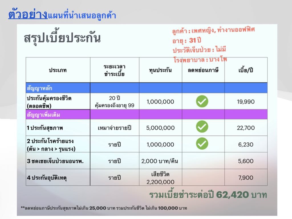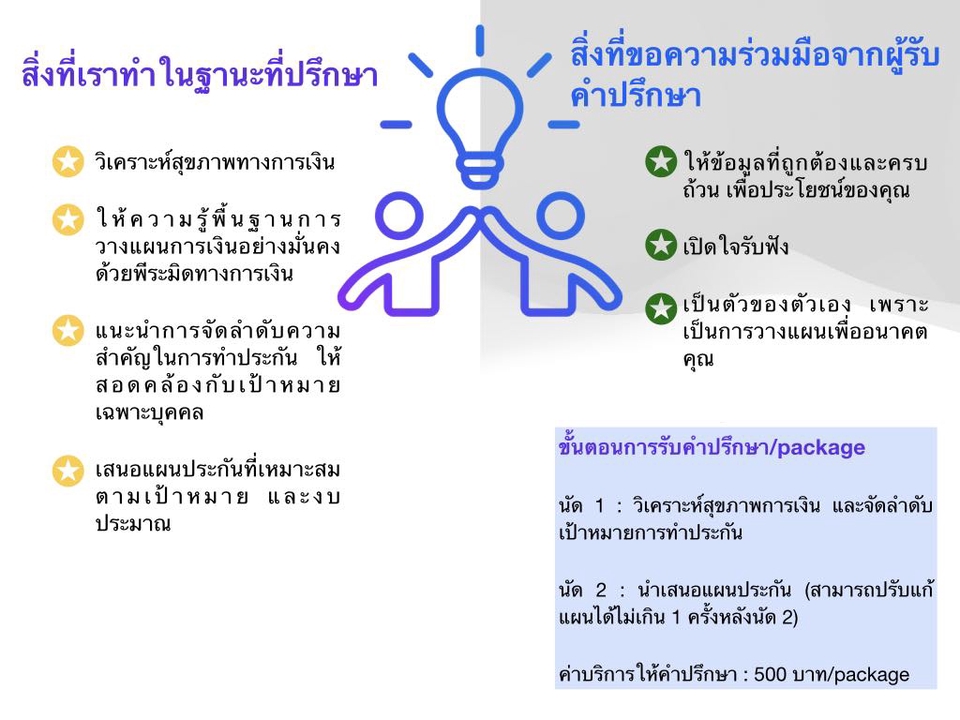 ฿5001. วิเคราะห์สุขภาพทางการเงินของคุณ 2. พูดคุยเกี่ยวกับเป้าหมาย หรือความกังวลทางการเงินที่คุณต้องการวางแผน 3. นำเสนอแผนที่สอดคล้องกับเป้าหมาย และงบประมาณของคุณ 4. หากต้องการให้เราดูแลคุณอย่างต่อเนื่อง สามารถทำประกันกับเราได้เลยค่ะ ^^