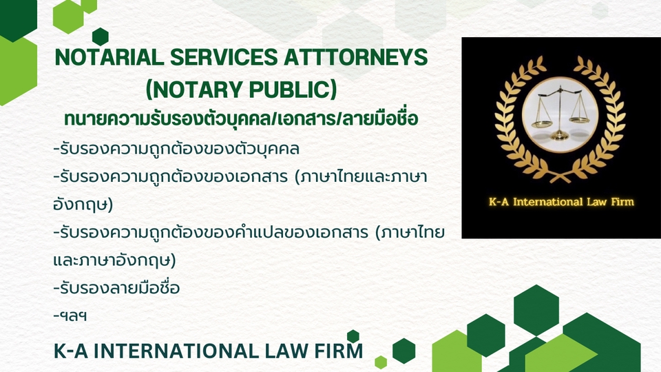 K-A International Law Firm เรามีประสบการณ์และให้บริการด้านกฎหมายในบริษัทขนาดใหญ่มาเกือบ 20 ปี ไม่ว่าจะเป็น -การดำเนินคดีทั้งคดีแพ่ง คดีอาญา คดีแรงงาน คดีชำนัญพิเศษ ฯลฯ -ทีี่ปรึกษากฎหมาย -สัญญาทุกประเภททั้งภาษาไทยและภาษาอังกฤษ -การรับรองความถูกต้องของเอกสาร รวมถึงการรับรองลายมือชื่อ ทัั้งภาษาไทยและภาษาอังกฤษ (Notarial Services Attorney) -Business operation ต่าง ๆ
