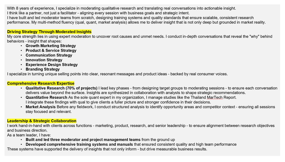 Qualitative Moderator: นักสัมภาษณ์สำหรับงานวิจัยทั้ง Focus Group และ In-depth Interview PAST EXPERIENCE - 8 Years of Moderating Experience (2018-2024) - Head of Moderator & Moderator at Hummingbirds Consulting - Consulting at Sasin Management Consulting (Interview and create corporate strategy)