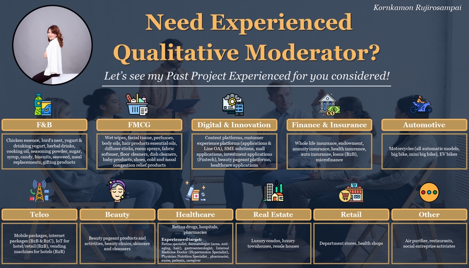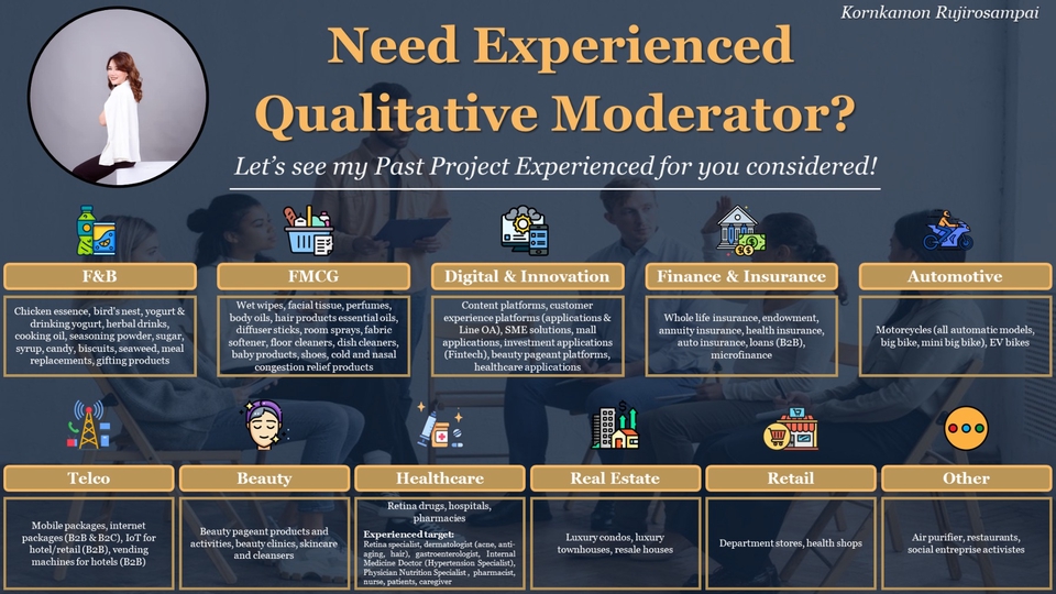 สัมภาษณ์งานวิจัย Focus group และ In-depth Interview Experienced Products: FMCG: Perfumes, body oils, essential oils, diffuser sticks, room sprays, chicken essence, bird's nest, seaweed, yogurt, cooking oil, seasoning powder, sugar, syrup, meal replacements, wet wipes, floor cleaners, dish cleaners, baby products, shoes Beauty: Beauty pageants products and activities, beauty clinics, skincare and cleanser Retail: Department stores, healthy shop Real estate: Luxury condos, luxury’s townhouse, resale houses Healthcare: Retina drug, hospitals, pharmacies Digital & Innovation: Content platforms, customer experience platforms (applications & Line OA), solution for SMEs, mall’s application, investment application (Fintech), beauty pageants platform Telco: Mobile packages, internet package (B2B&B2C), IoT for hotel/retail (B2B), vending machines for hotel (B2B) Finance & Insurance: Whole life insurance, endowment, annuity insurance, health insurance, auto insurance, loan (B2B), microfinance, Automotive: Motorcycles, EV bikes Other: Air purifiers, restaurant, social enterprise’s activity ขั้นตอนการทำงาน 1. ลูกค้าบรีฟ Objective งาน และ Product Background พร้อมแจ้งวันที่และเวลาสัมภาษณ์ เพื่อล๊อกตาราง Moderator 2. ลูกค้าส่ง Discussion Guideline และ Materials ต่าง ๆ ให้กับ Moderator 3. นัดประชุม หรือ Quick call เพื่อ agree ทุกอย่างร่วมกัน 4. แจ้งสถานที่, วัน, เวลาให้กับ Moderator 5. Moderator เข้าสัมภาษณ์ 6. Discuss กันหลังจากจบการสัมภาษณ์แต่ละครั้ง เพื่อปรับ flow และ ถามถึงสิ่งที่ลูกค้าต้องการเพิ่มเติม เพื่อปรับเปลี่ยนกันระหว่างทาง เพื่อให้ได้ข้อมูลตามที่ลูกค้าต้องการมากที่สุด