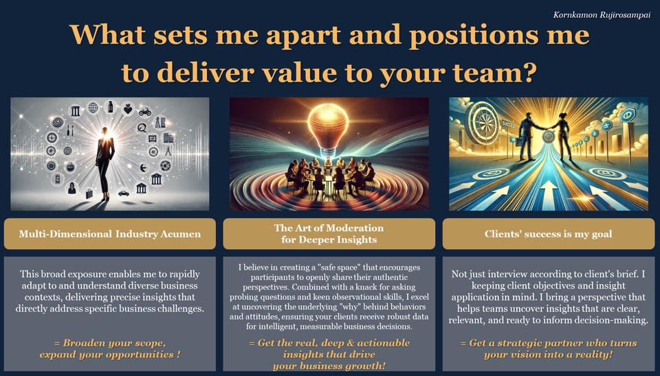 ฿10,000- สัมภาษณ์ in-depth Interview ท่านละ 2 ชั่วโมง - การให้คำปรึกษาถึงคำถามการสัมภาษณ์ (Discussion Guideline) และ Concept Test - การทำงานแบบยืดหยุ่นและปรับเปลี่ยนร่วมกันได้ตลอดทาง