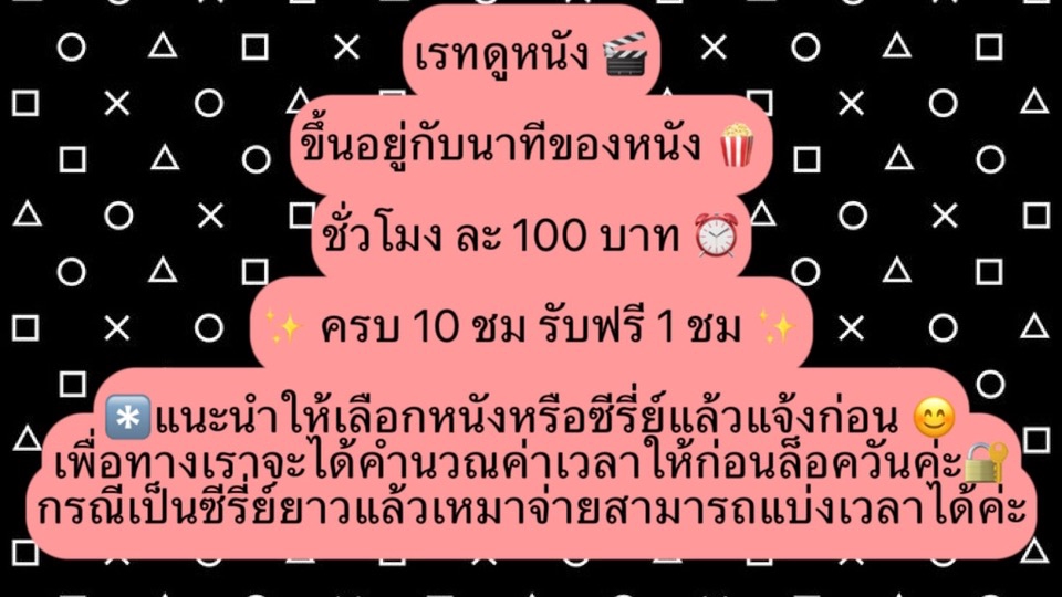 ฿100ดูหนัง/ซีรี่ย์ 📱💻 แพ็คเริ่มต้นสำหรับคนอยากลอง 🤓 1 ชั่วโมง ✨ คะแนนแพ็คเกจ ชั่วโมงละ 1 แต้ม 🎟️ สะสมครบ 10 แต้ม ฟรี 1 ชั่วโมง
