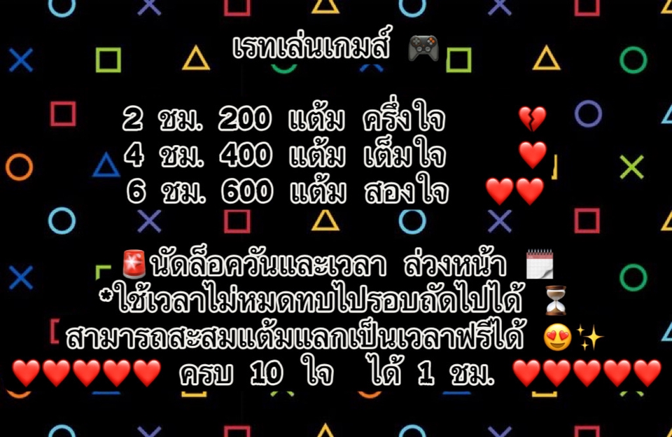 ฿200เล่นเกมได้ทั้ง PC/Mobile 📱💻 เวลา 2 ชั่วโมง ⏰ เหมาะกับคนที่อยากทดลอง 👈🏻 เลิกเล่นก่อนแล้วเวลาเหลือสามารถทบไปเล่นครั้งถัดไปได้ค่ะ ✨ คะแนนแพ็คเกจ ครึ่งใจ 💔 สะสมครบ 10 ใจแลกฟรี 1 ชั่วโมง ค่ะ 🥰