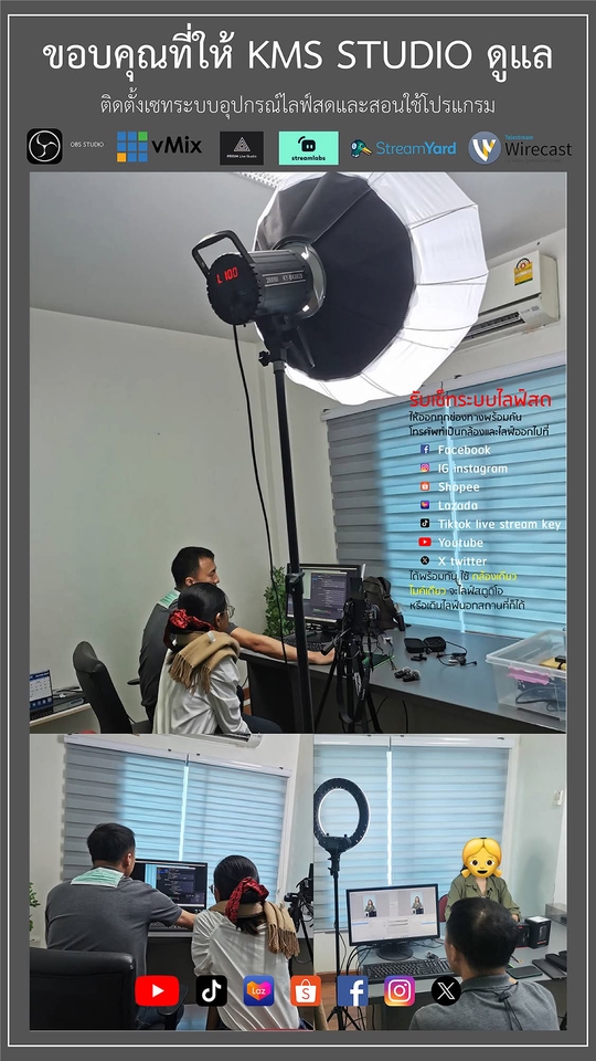 - สอนตั้งค่าคอมพิวเตอร์ ก่อน ติดตั้ง OBS - สอนการตั้งค่า Obs , Prism live , vMix - สอนการใช้งาน โปรแกรม Obs , Prism live , vMix , TikTok Live Studio อย่างละเอียด - สอนต่อโทรศัพท์เป็นกล้อง - สอนการตั้งค่าการปรับกล้องและเสียง - สอนเทคนิคการจัดแสง - สอนการไลฟ์ 5 ช่องทาง TikTok ,Shopee, facebook , YouTube และ IG - สอนปัดตะกร้า Shopee , TikTok - สอนวิธีการบันทึกวีดีโอรีรัน TikTok, Facebook, Shopee - สอนทํา กรอบ ตัวหนังสือ ด้วย Canva - สอนนำฟิลเตอร์ TikTok ไลฟ์ Facebook - สอนวิธีการปรับสีผิว+ฟิวเตอร์ ( ไม่มีสอนใน YouTube ) - เทคนิคการซูมสินค้า ด้วยกล้องตัวเดียว - ช่วยเหลือฉุกเฉิน ฟรี 1 ปี และ ติดตั้งอุปกรณ์ทั้งหมด *** ฟรี ***