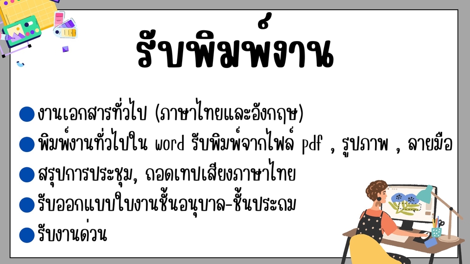 พิมพ์งานทั่วไปใน word รับพิมพ์จากไฟล์ pdf , รูปภาพ , ลายมือ (ต้องอ่านออก) รับออกแบบใบงานชั้นอนุบาล-ชั้นประถม รับสรุปการประชุม (ทางราชการ / บริษัททั่วไป) รับงานด่วน 1-2 วัน แก้ไขงานได้ 2 ครั้ง ขั้นตอนการทำงาน 1. ระบุชนิดของงานว่าเป็นงานประเภทไหน ในชิ้นงานต้องการอะไรบ้าง 2. ระบุเวลาในการส่งงาน (งานด่วนมีคิดค่าบริการเพิ่ม) 3. ระบุนามสกุลของไฟล์งานว่าต้องการไฟล์งานประเภทใด 4. ไม่มีการจัดส่งเป็นรูปเล่มหรือCD 5. ราคาขึ้นอยู่กับปริมาณงานและความยากง่าย