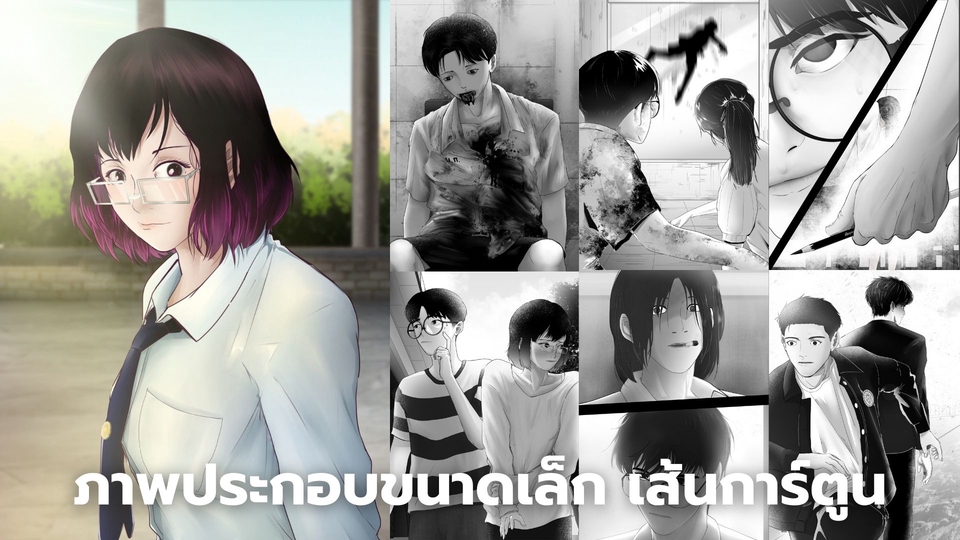 ฿1,200- ภาพประกอบขนาดเล็ก 3 ภาพ - ภาพพื้นหลัง 3 ภาพ (ถ้ามี) - ภาพตัวละคร(ถ้ามี) 1 ภาพ (รูปแบบ PNG) - ไทโปรูปแบบ PNG