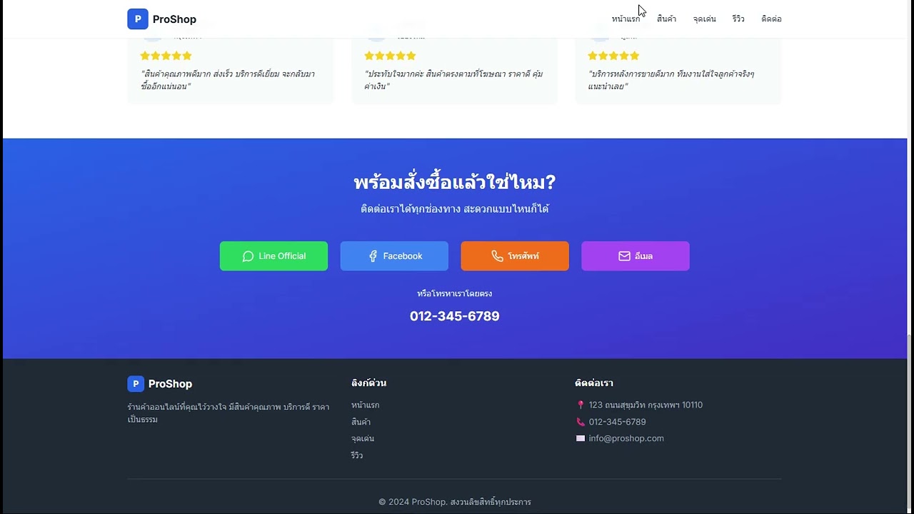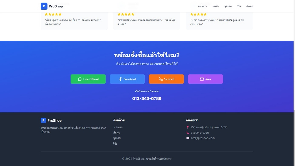 ฿3,000เช่น เว็บไซต์โปรโมทสินค้า, เว็บไซต์กิจกรรม, เว็บไซต์พอร์ตโฟลิโอ สิ่งที่ลูกค้าจะได้รับ: - รองรับทุกอุปกรณ์ (Responsive) - ปุ่มติดต่อ (Line, Facebook, โทรศัพท์, อีเมล) - ติดตั้งSSLและรองรับSEOเบื้องต้น