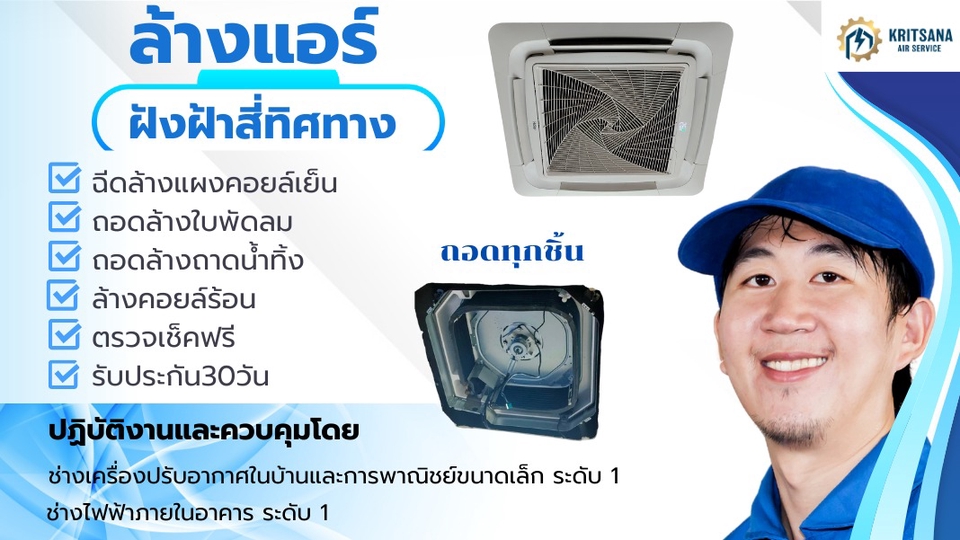 ฿1,500ล้างทำความสะอาดแผงคอยล์เย็น (ฟิลคอยล์) และโบเวอร์ ล้างทำความสะอาดแผ่นกรองอากาศ (ฟิลเตอร์) ล้างและทำความสะอาดระบบท่อน้ำทิ้ง ล้างทำความสะอาดคอยล์ร้อน ตรวจสอบจุดต่อสายไฟและขันให้แน่นหนา
