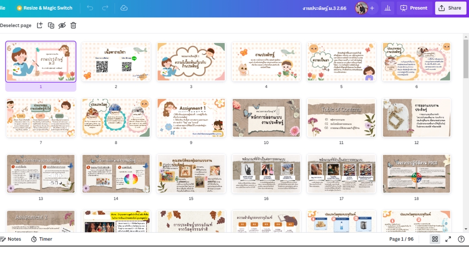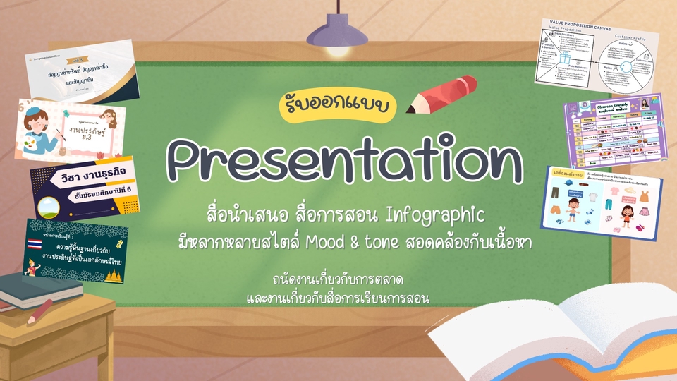 ออกแบบงาน Presentation & Infographic โดยใช้ Canva Pro / PPT ทำงานนำเสนอรายงาน จัอทำสื่อประกอบการสอน ระดับประถม-อุดมศึกษา - ถนัดเกี่ยวกับธุรกิจ การจัดการ การตลาด - สื่อประกอบการสอนทุกวิชา ทุกระดับชั้น ขั้นตอนการทำงาน 1. รับบรีฟงานจากลูกค้า 2. สืบค้นข้อมูล (ข้อมูล/รายละเอียดทั้งหมดที่สืบค้น จะถูกนำไปใส่ในสไลด์เพียงบางส่วนเพื่อไม่ให้ตัวหนังสือในสไลด์เยอะเกินไป) 3. จัดเรียงหน้า ตกแต่ง ใส่รูปภาพและตกแต่งแพทเทิร์น โทนสีให้สอดคล้องกับเนื้อหา 4. ส่งแบบร่างให้ลูกค้าตรวจสอบปรับแก้ ตามจำนวนครั้งในแพคเกจ 5. เมื่อลูกค้าพึงพอใจ จึงทำการส่งมอบชิ้นงาน พร้อมแบบร่างที่สามารถแก้ไขได้ รวมถึงเนื้อหาบางส่วนที่ไม่ได้ปรากฎในสไลด์ เป็นข้อมูลเพิ่มเติม ลูกค้าสามารถนำไปใช้เป็นสคริปต์นำเสนอ เพื่อเเสดงถึงความเป็นมืออาชีพมากขึ้น