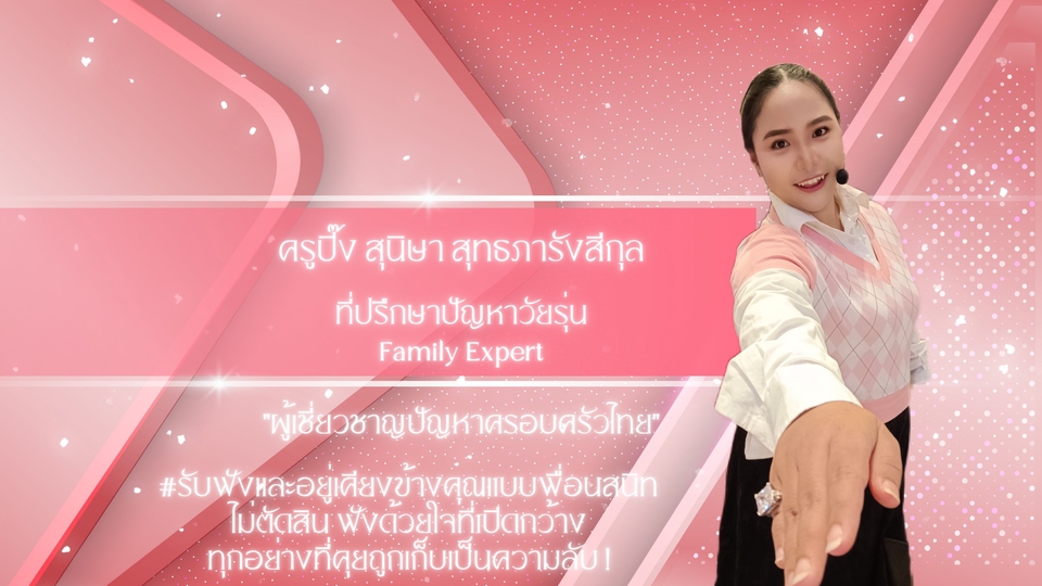 รับฟัง อย่างไม่ตัดสิน พร้อมอยู่เคียงข้างอย่างเพื่อนสนิทที่รู้ใจคุณ ทุกเรื่องที่คุยกันถูกเก็บเป็นความลับ เป็นพื้นที่ปลอดภัยให้คุณได้เข้าใจตัวเอง เข้าใจคนรอบข้าง เข้าใจคนในครอบครัว และไม่เก็บเอาเรื่องราวเหล่านั้นไปเป็นปัญหากวนใจคุณอีกต่อไป พร้อมทั้งชี้แนวทางให้คุณเป็นแสงสว่างของครอบครัว เพราะคุณคือแสงสว่างดวงแรกแห่งครอบครัวคุณ เมื่อคุยจบคุณได้รู้จักตัวเองอย่างลึกซึ้งจากภายใน แล้วคุณจะรู้ว่าทุกปัญหาที่เกิดขึ้นดีเสมอ ขั้นตอนการทำงาน 1. แนะนำตัว ทักทาย 2. นัดหมายเวลาที่สะดวกพูดคุย / เจอหน้ากัน แบ่งเป็น รอบเช้า รอบบ่าย รอบเย็น รอบกลางคืน วันธรรมดา/วันเสาร์-อาทิตย์ 3. ทำความรู้จักกันสักนิด 4. บอกเล่าพื้นฐานตัวคุณ และครอบครัวคุณให้ฟังหน่อย 5. เล่าแบ่งปันเรื่องราวที่คุณทุกข์ใจ มีปัญหา 6. สิ่งที่คุณต้องการได้รับจากการพูดคุยกัน หรือ ผลลัพธ์ที่คุณอยากให้เกิดขึ้น 7. ร่วมกันหาทางออกของปัญหา/ความทุกข์ใจของคุณ ในวิธีที่เหมาะสมและเข้ากันกับบริบทของคุณและครอบครัวคุณ 8. สรุปรายละเอียดการเข้ารับคำปรึกษา 9. นัดหมาย ติดตาม ประเมินผลการเข้ารับคำปรึกษา